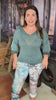 She’s wearing our Clean Slate Knit in Forest Green (sadly sold out) paired with our Bright Side Drawstring Pants in Arctic.