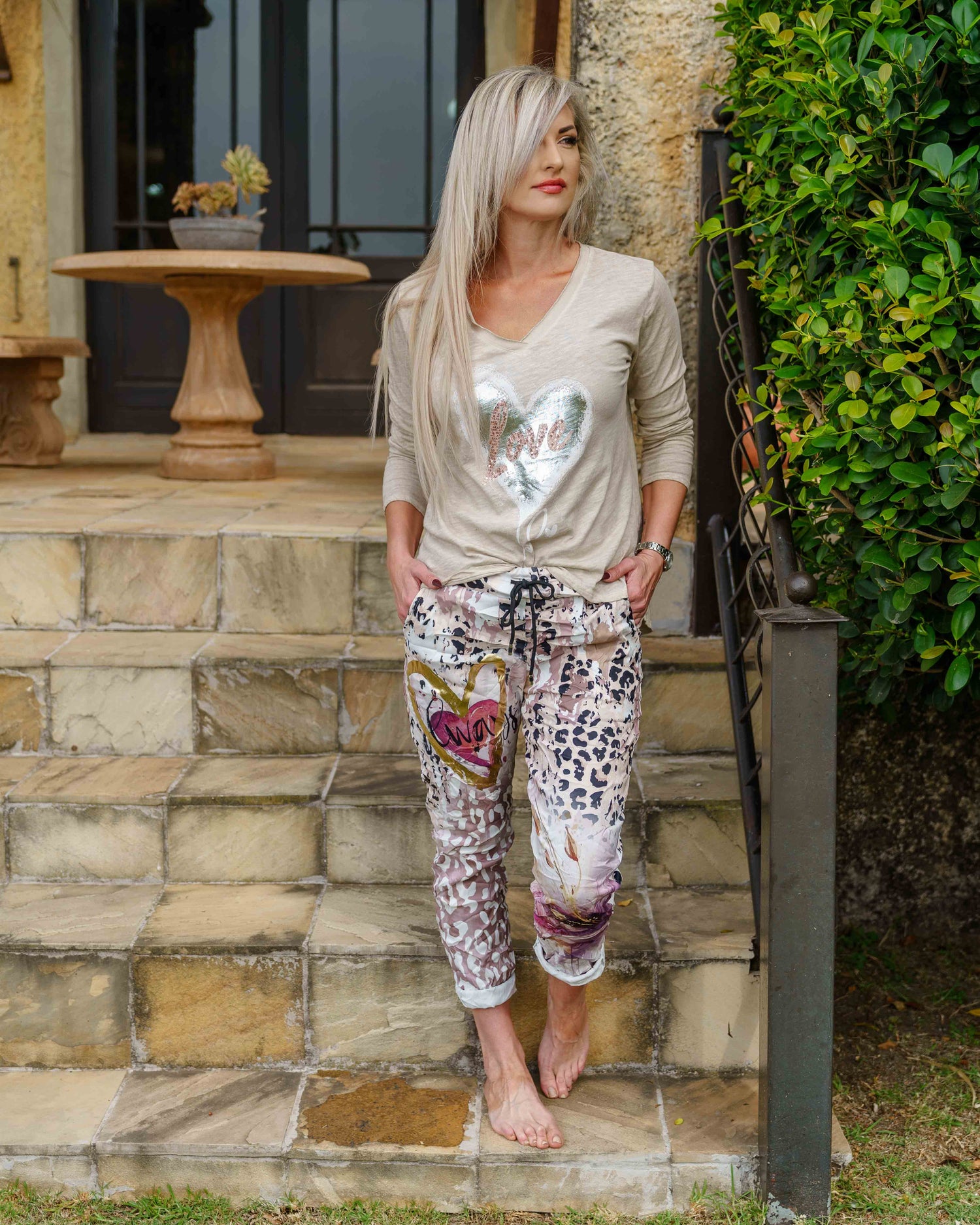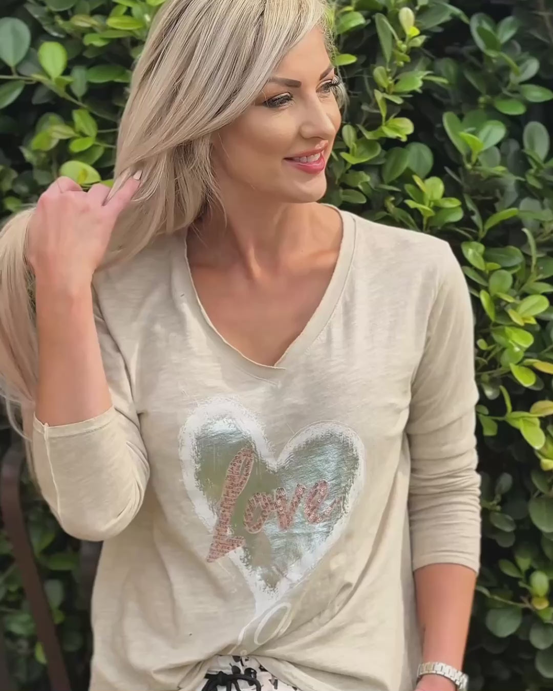 A laid-back essential with a romantic twist, this long sleeve cotton tee brings softness and charm to your everyday wardrobe. The neckline is a subtle V with raw edge trimming for a slightly undone, effortless feel. Its rounded hem and gently longer back panel create a flattering silhouette with a feminine flow. The standout feature is the heart decal on the front panel, detailed with white and silver foil and finished with a delicate pink sequin “love” script that catches the light just right. Whether worn solo or layered under a jacket, this tee adds a gentle sparkle to your casual days