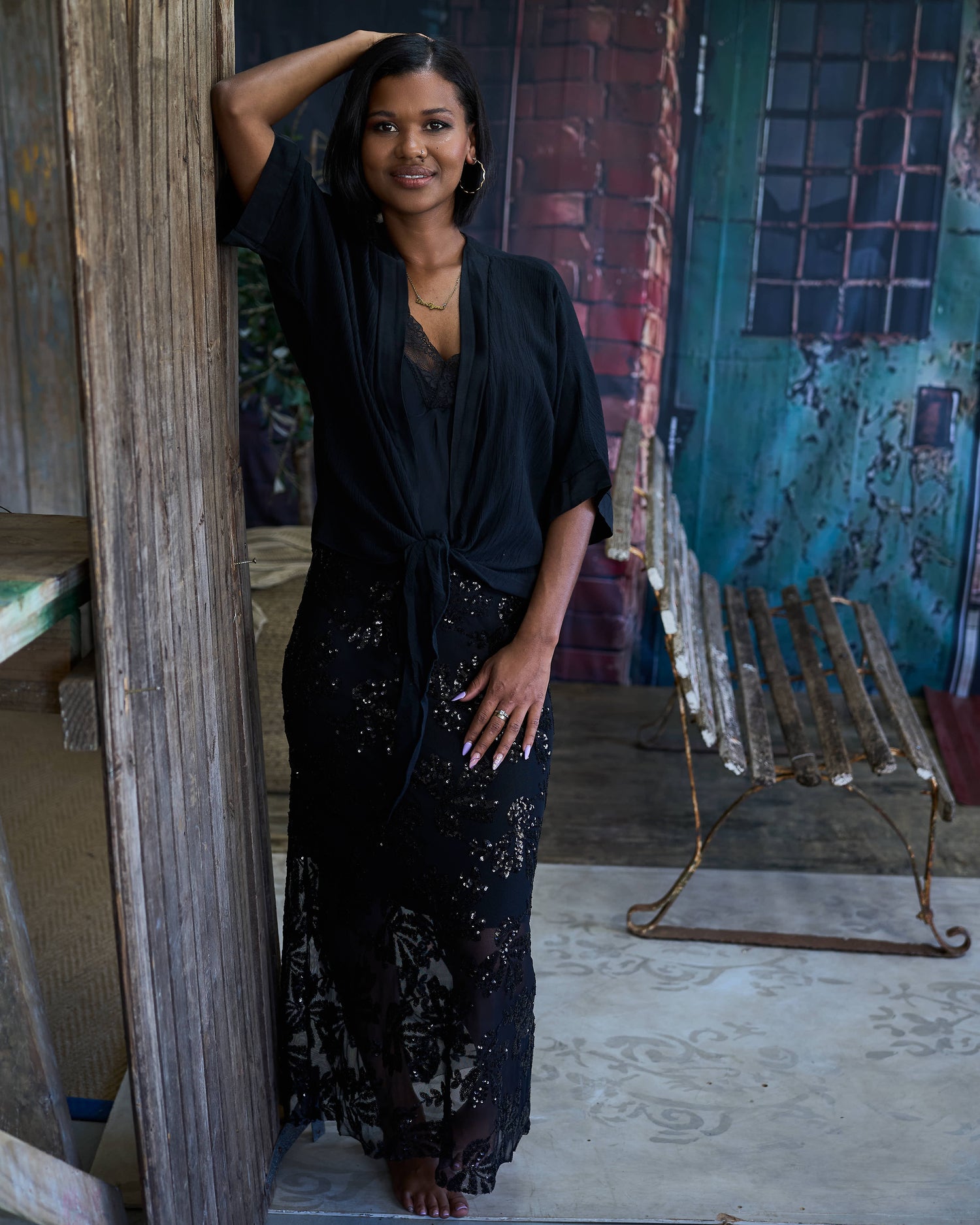 This elegant bolero adds the perfect finishing touch to any outfit. Designed with a soft, fluid drape, it features wide sleeves that create a relaxed yet sophisticated silhouette. The front tie allows you to adjust the fit to your liking, whether you prefer it loosely layered or softly cinched. Subtle silky trim detailing adds a beautiful contrast and a touch of refined texture, elevating the overall look