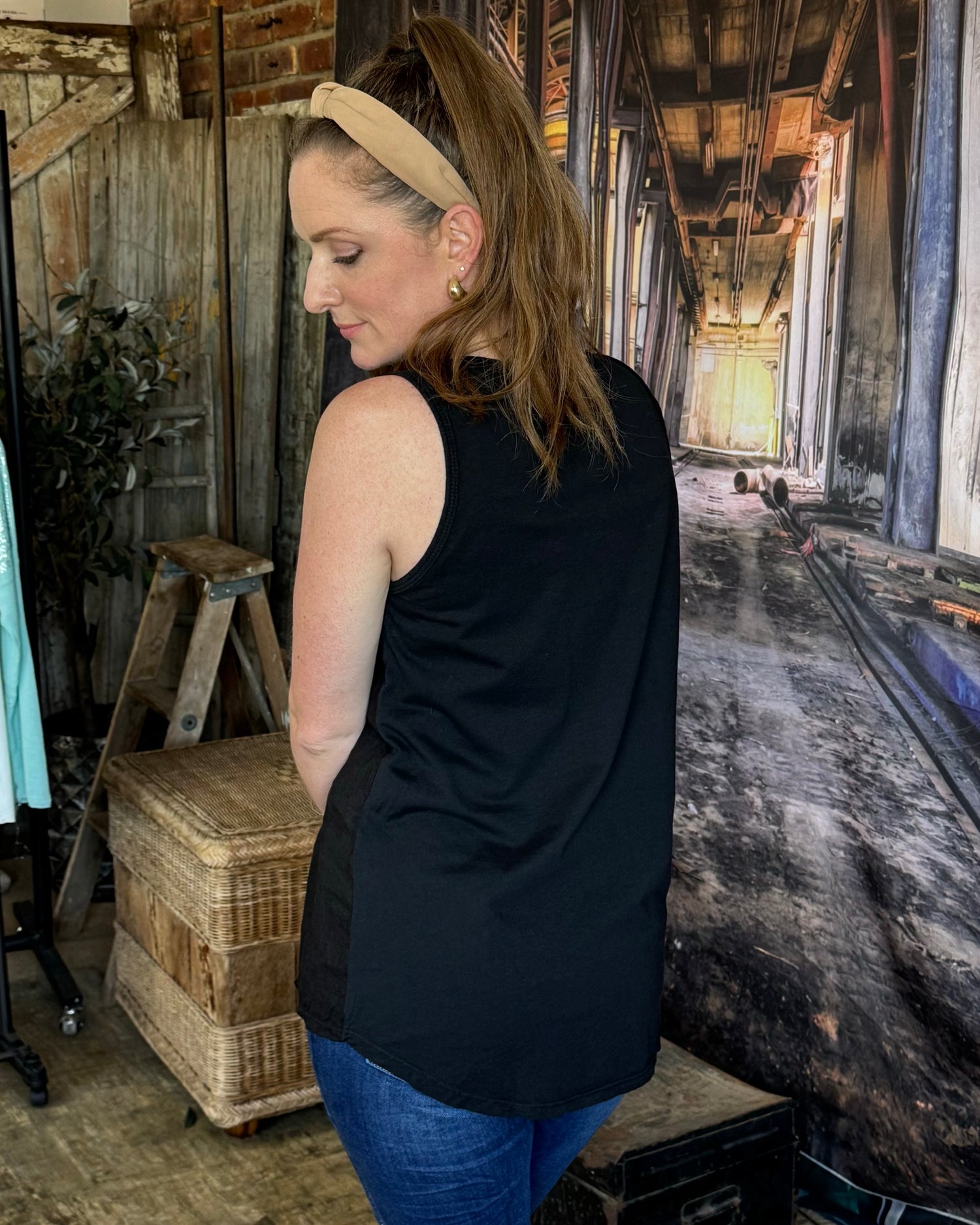 Cool, light, and effortlessly easy, this tank-style linen vest is the kind of piece you reach for on scorching days or layer under a shirt or jacket when you want something breathable. The front is crafted from pure linen for that natural, airy feel, while the stretch-cotton back panel adds comfort and a flexible fit. Broad shoulder straps ensure no bra straps peek through, keeping the look clean and confident. Finished with a subtle “Perfectly Imperfect” embellishment across the front, it’s a simple throw-on-and-go favourite with a touch of charm