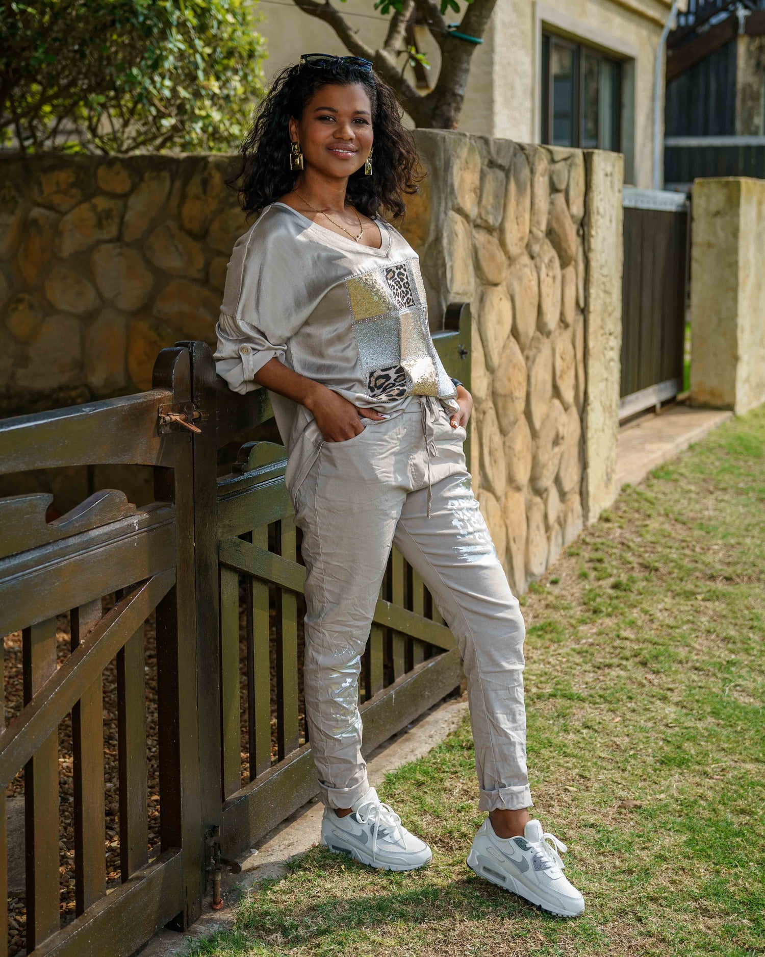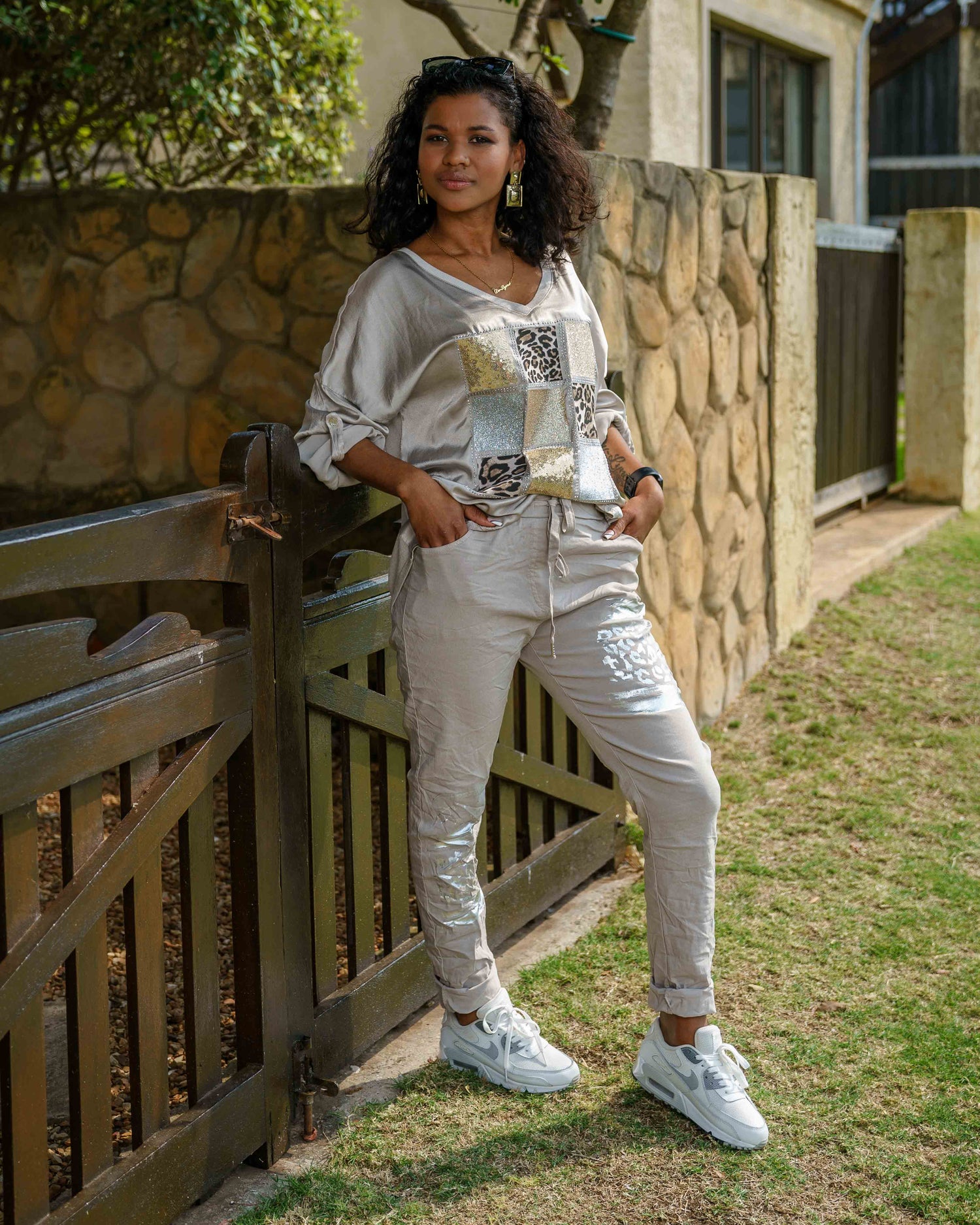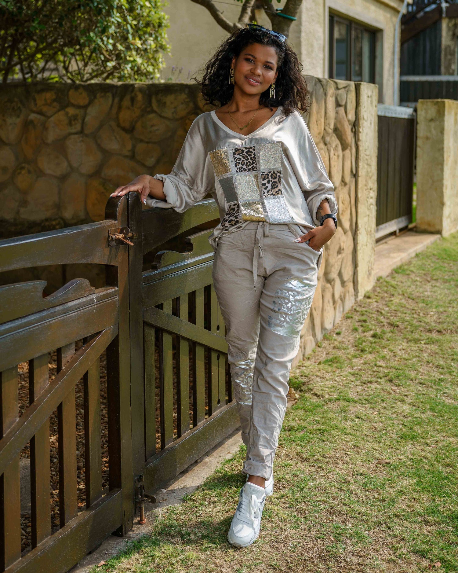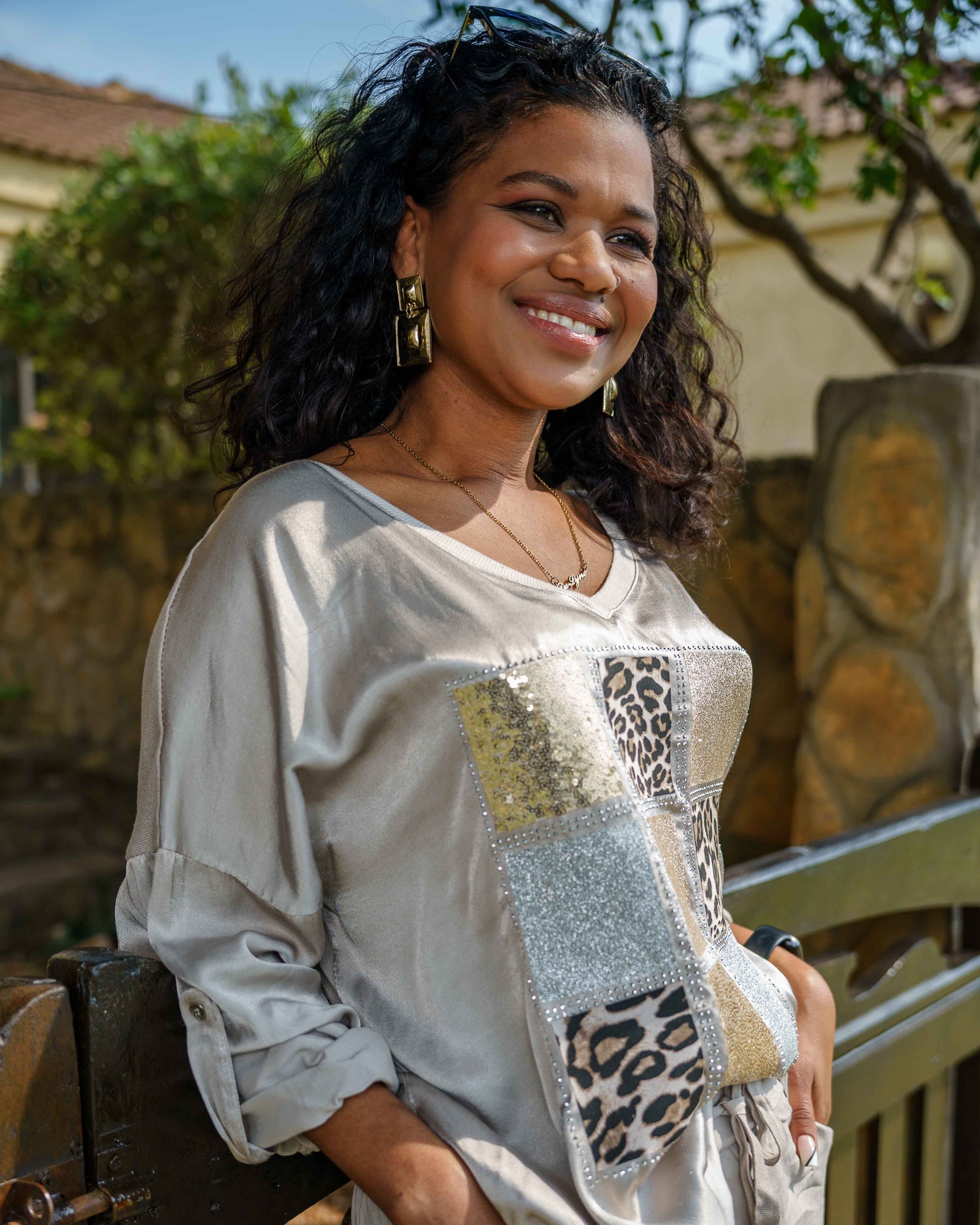 Own the spotlight with this ultra-sexy top, designed to turn heads. The front panel has a luxurious silk-like feel, featuring a striking centre design of silver and gold glitter, foil accents, leopard print, and edgy silver studs. A flattering V-neckline and pull-tab sleeves let you personalise your look, while the lightweight, stretchy back panel ensures all-day comfort without sacrificing style