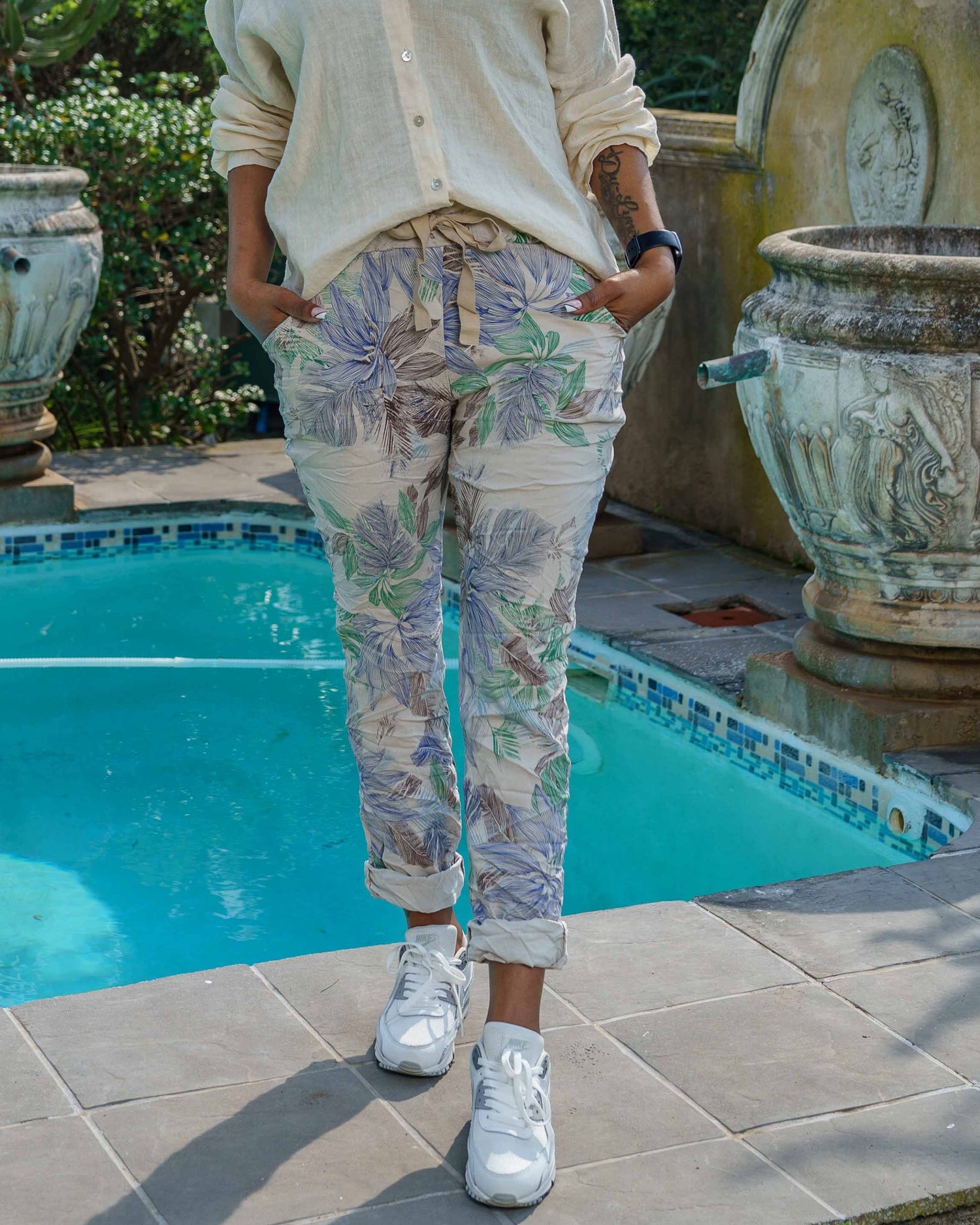 These drawstring pants bring subtle style with an easy, comfortable fit. The elasticated waistband ensures effortless wear, while side and back pockets add everyday practicality. The fabric is adorned with a fine leaf decal in soft hues of brown, blue, and green - delicate like hand-drawn sketches. Instead of standing out boldly, the design blends gently into the fabric, creating an understated yet artistic look