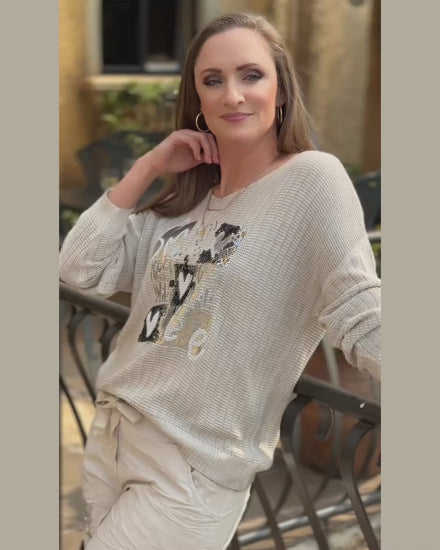 An easygoing knit made for throw-on-and-go days, this piece is as comfortable as it is eye-catching. Crafted with a soft, panel-like stitch, it features mid-arm sleeves and a classic round neckline. The front shines with silver sequins and foil script detail, while ribbed cuffs and hem give it a polished finish. Casual, playful, and just the right amount of sparkle