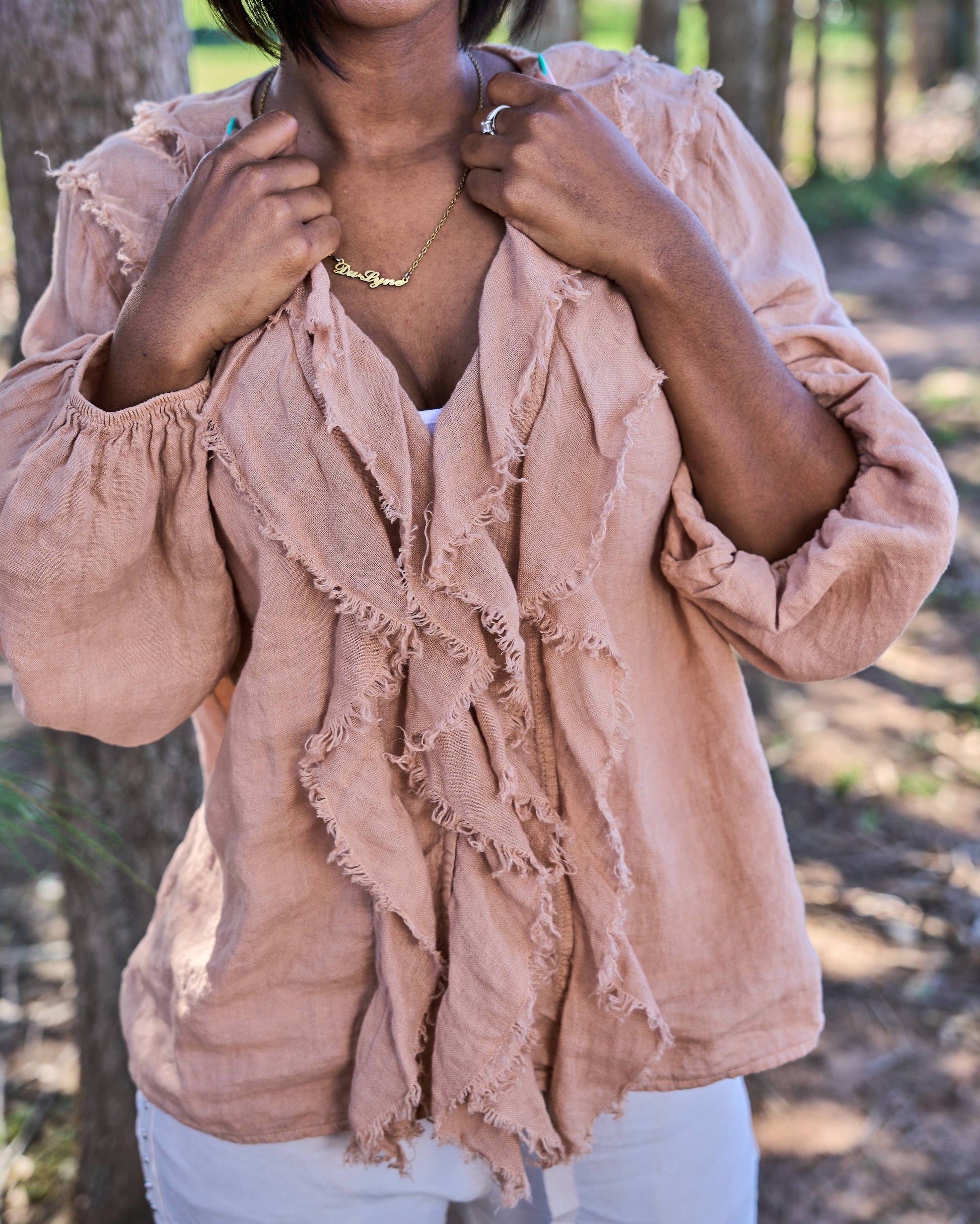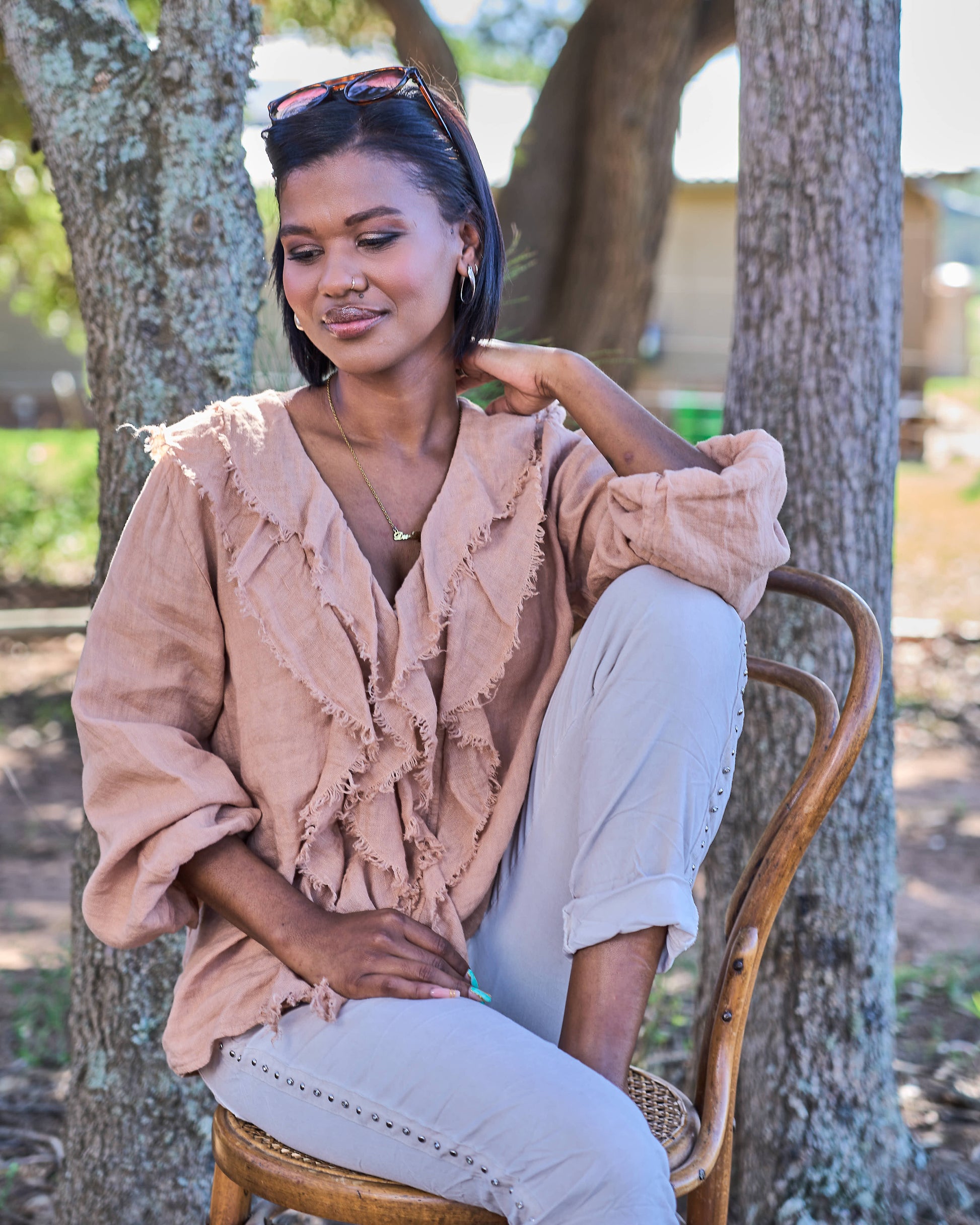 This top is all about statement detail with a beautifully soft, wearable feel. Crafted from breathable linen, it drapes effortlessly while the cascading frill front brings movement and drama to every step. The textured, raw-edge frills create a slightly undone, elevated look that feels both feminine and bold. With its relaxed fit and easy button-down design, it’s a standout piece that still feels comfortable and versatile enough for everyday wear