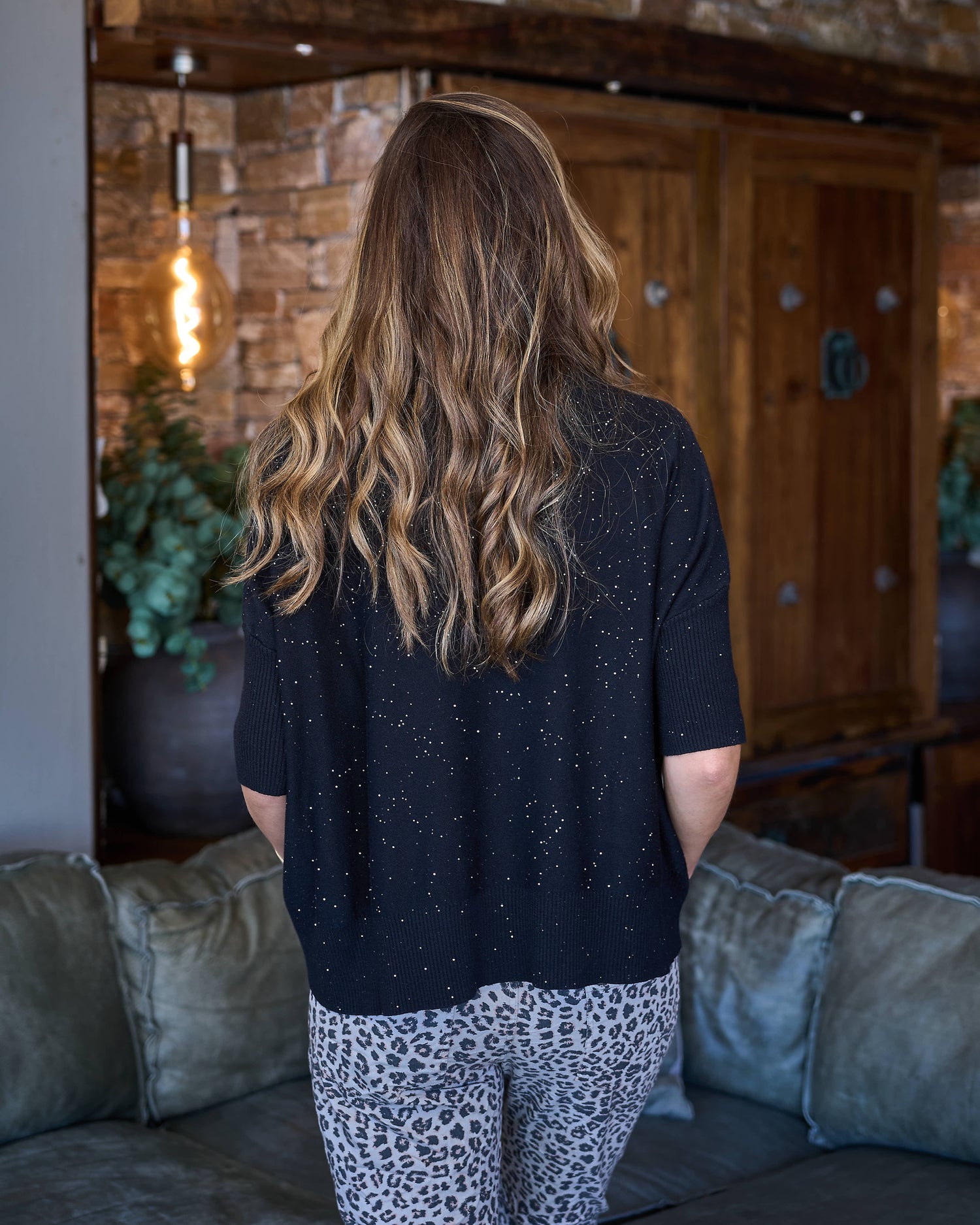 This softly structured knit brings effortless sparkle to everyday wear. Designed with a ribbed round neckline, cuffs, and hem, it offers a comfortable, polished fit with a gentle drape. The fabric feels beautifully soft against the skin and is finished with tiny, subtle sequins that add a refined shimmer without being overpowering. A slightly longer back panel provides extra coverage, making it an easy, flattering piece to style day or night