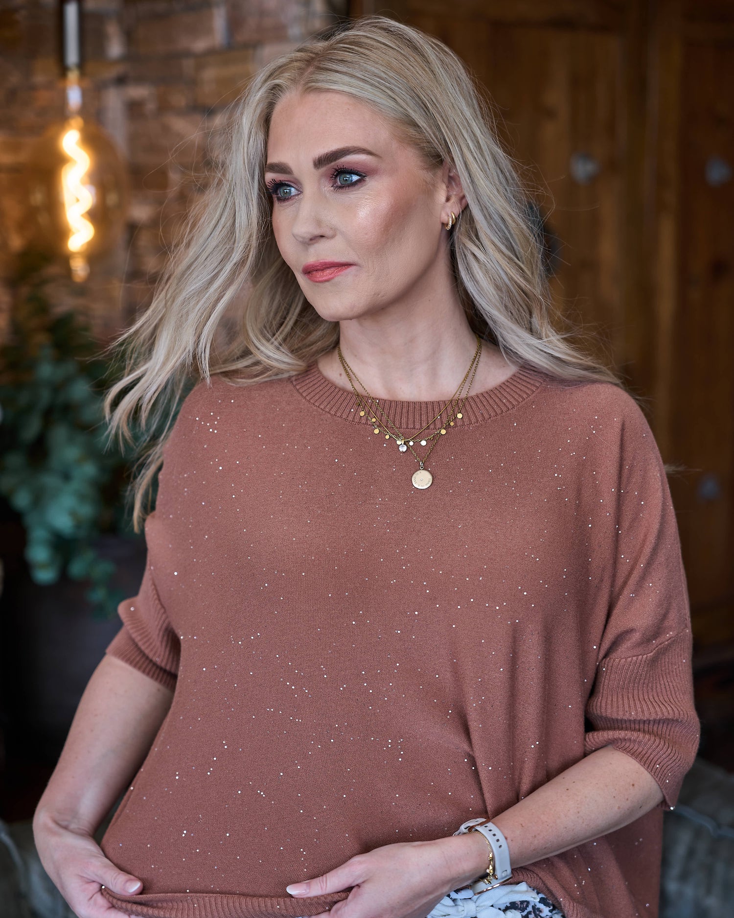 This softly structured knit brings effortless sparkle to everyday wear. Designed with a ribbed round neckline, cuffs, and hem, it offers a comfortable, polished fit with a gentle drape. The fabric feels beautifully soft against the skin and is finished with tiny, subtle sequins that add a refined shimmer without being overpowering. A slightly longer back panel provides extra coverage, making it an easy, flattering piece to style day or night