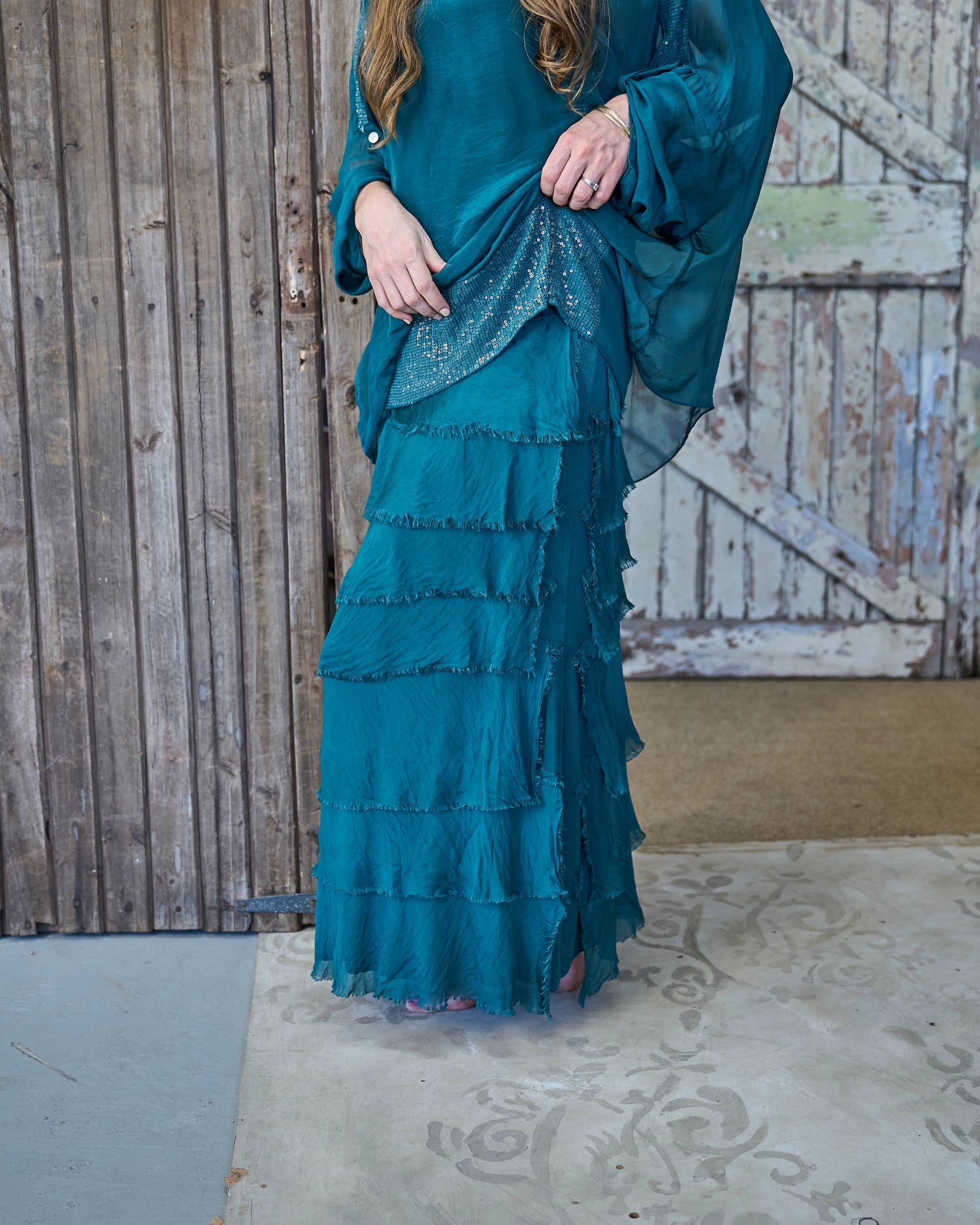Not fond of wearing a dress? This look gives you the elegance of one while keeping the comfort and versatility of a two-piece set. The skirt features beautiful layered silk panels that create a flattering, flowing silhouette, while the thick, stretchy waistband ensures a comfortable and flexible fit. When paired with the matching top, it creates the illusion of a dress while still allowing you the ease and movement of separate pieces. You’re purchasing the skirt only - other pieces shown in the images are sold separately