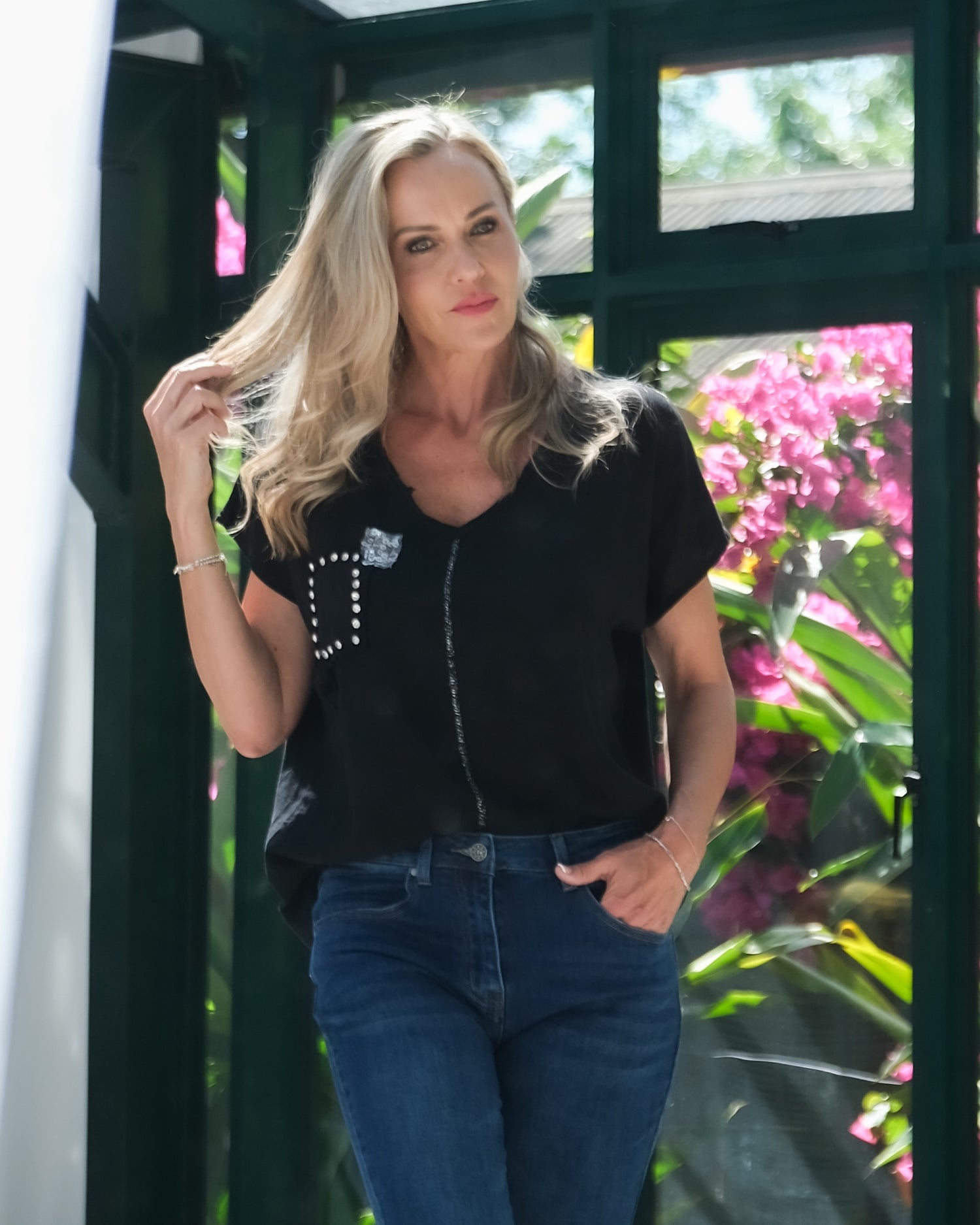 This linen blend T-shirt style top is a true standout piece with its mix of textures and details. Designed with a raw edge V-neckline and delicate fringe trimming, it sets the tone for a relaxed yet refined look. Down the front panel, silver thread detailing catches the light in just the right way. A decorative pocket-like patch adds even more character, finished with matte silver sequins, diamanté studs, and a touch of anglaise border work. The sleeves drape softly over the arms for an effortlessly flattering shape. Garment-dyed for a sophisticated finish, the color has a unique, slightly uneven effect that makes each piece one of a kind
