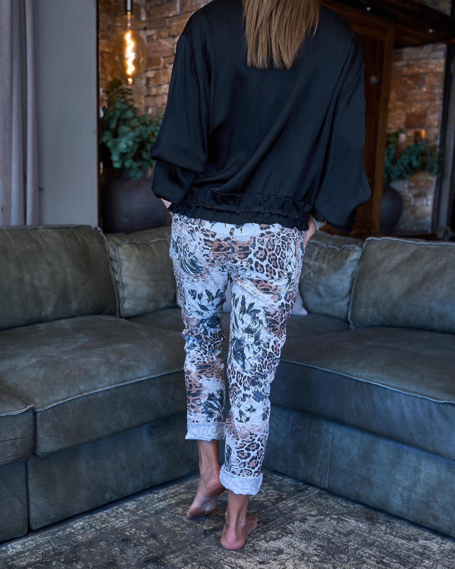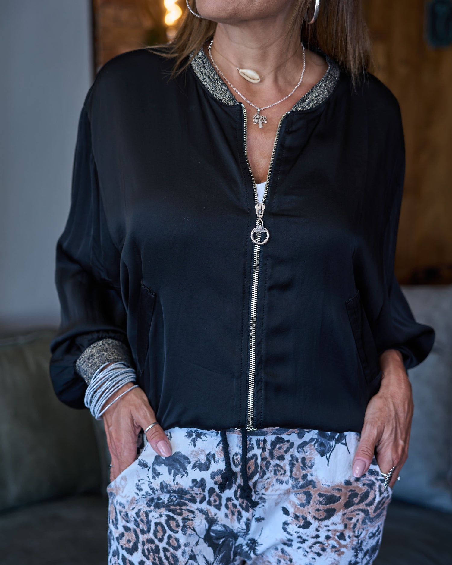 Make a bold yet timeless statement with this sleek in-between weather jacket, crafted from a soft and silky viscose-silk blend. The fully zipped front and adjustable drawstring hem allow for personalised styling, while ribbed cuffs and a round neckline add a sporty-chic finish. Decorative side pockets enhance the design without adding bulk. Clean, modern, and endlessly versatile, this black jacket is an elevated essential you’ll reach for season after season