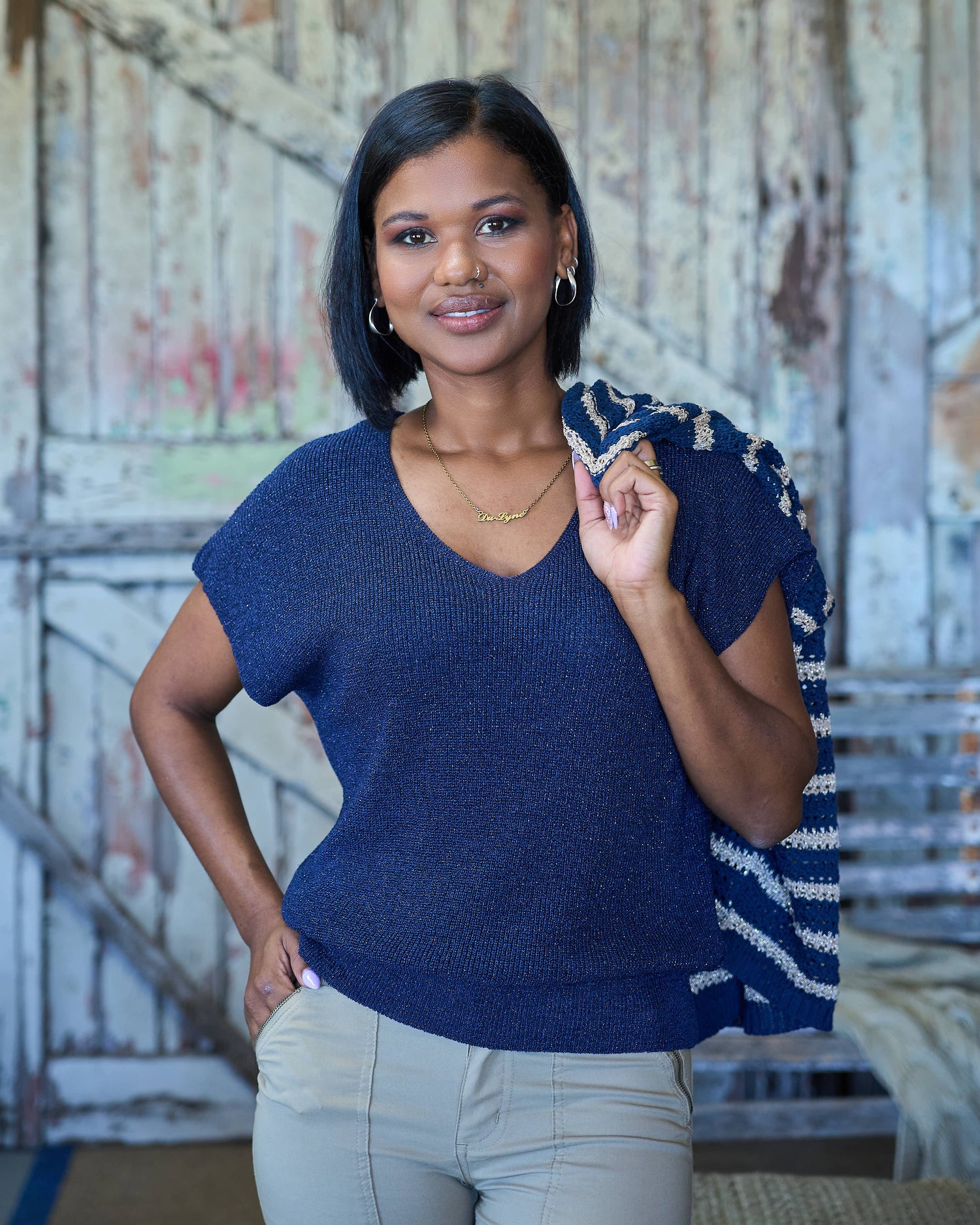 This navy lurex knit is a beautiful blend of subtle shimmer and effortless style. The delicate lurex thread woven throughout adds a soft sparkle that catches the light without being overpowering. Designed with a relaxed fit through the body and a slightly more fitted hem, it creates a flattering shape while still feeling comfortable to wear. The slightly shorter body length makes it ideal to pair with high-waisted pants or skirts for a balanced, modern look