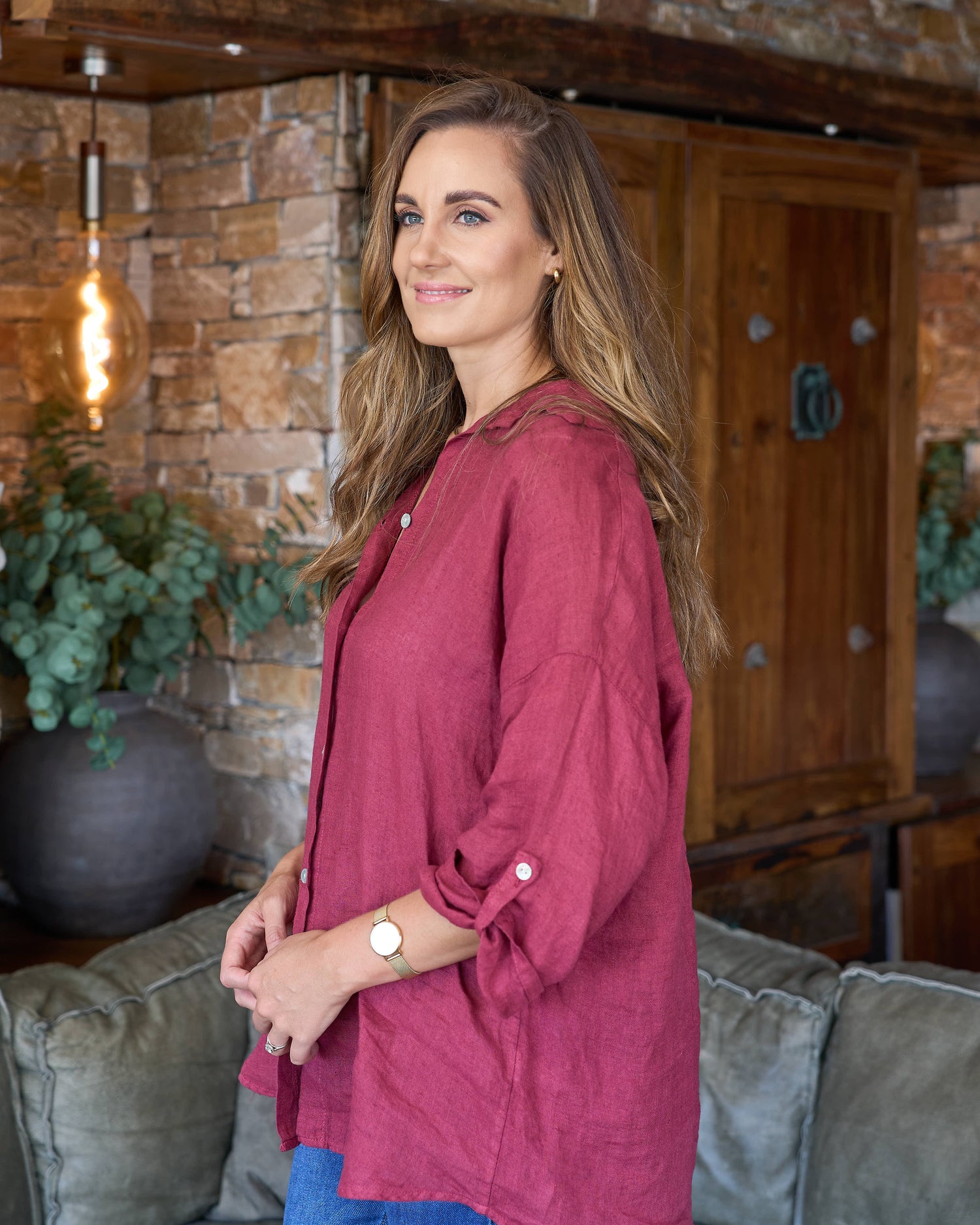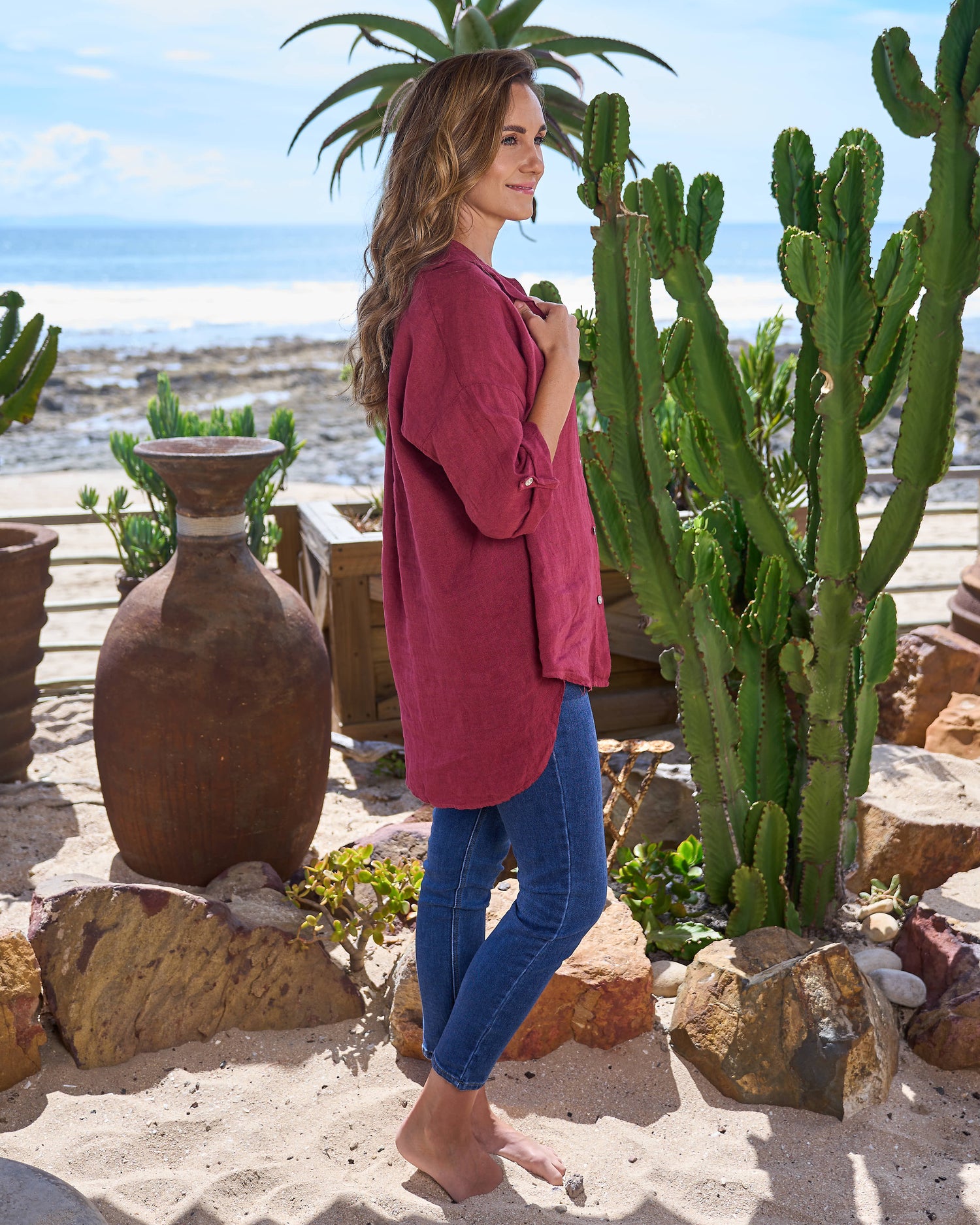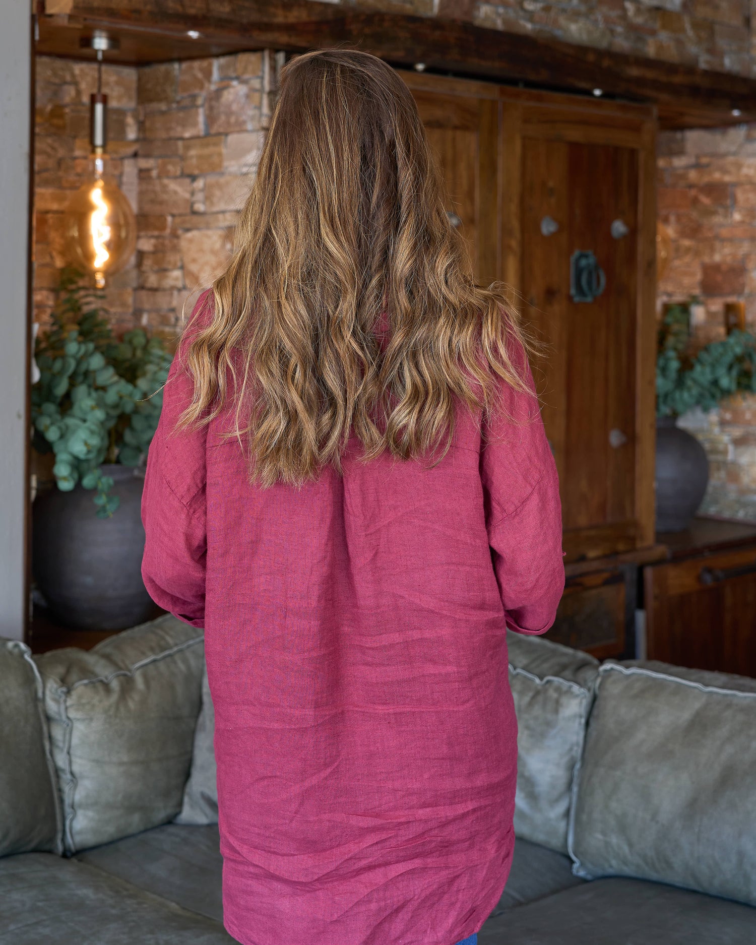 A true wardrobe staple, this button-down linen shirt is the definition of timeless summer style. Designed with a feminine soft collar and delicate shell buttons, it brings effortless polish to any look. The long-length cut offers extra coverage, with a rounded hem that flatters the shape and a slightly longer back for easy wear. Sleeves reach to the elbow and feature pull tabs, letting you roll them up or down to suit your mood. Light, breathable, and endlessly versatile - this is the shirt you’ll reach for again and again
