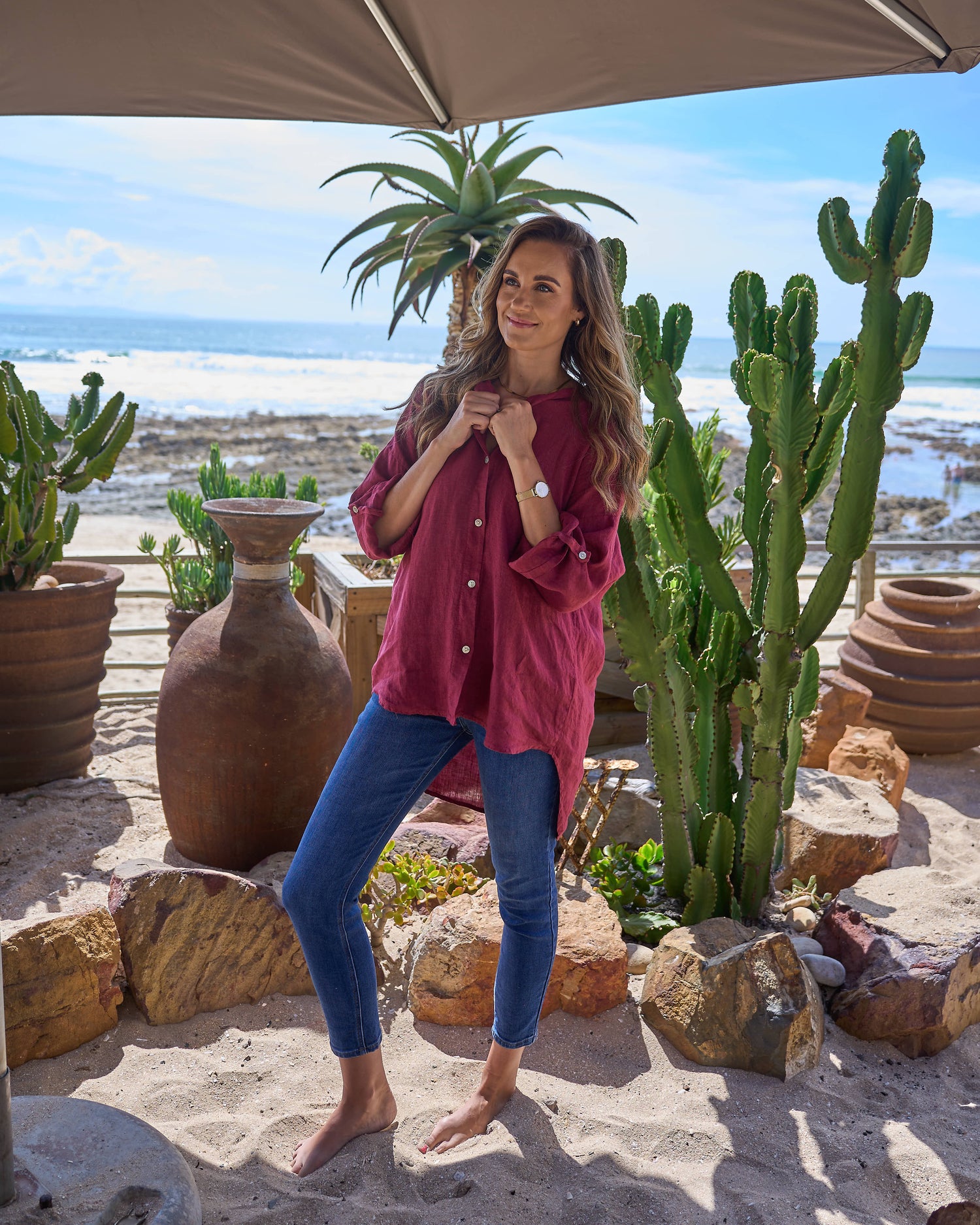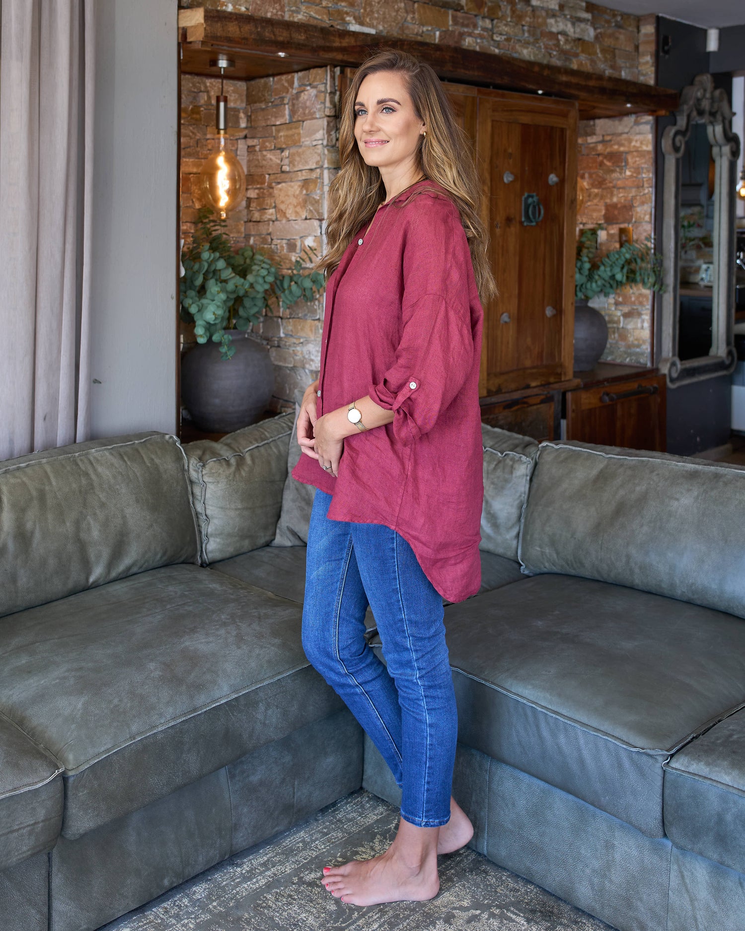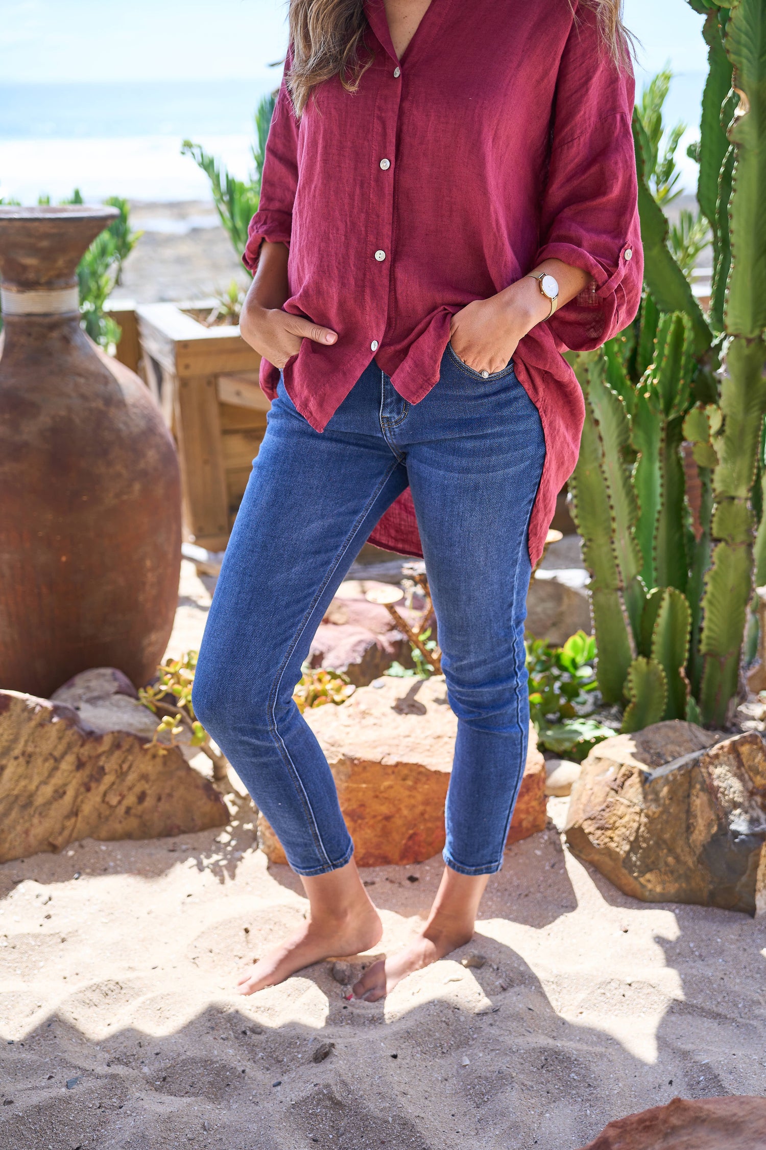 A true wardrobe staple, this button-down linen shirt is the definition of timeless summer style. Designed with a feminine soft collar and delicate shell buttons, it brings effortless polish to any look. The long-length cut offers extra coverage, with a rounded hem that flatters the shape and a slightly longer back for easy wear. Sleeves reach to the elbow and feature pull tabs, letting you roll them up or down to suit your mood. Light, breathable, and endlessly versatile - this is the shirt you’ll reach for again and again