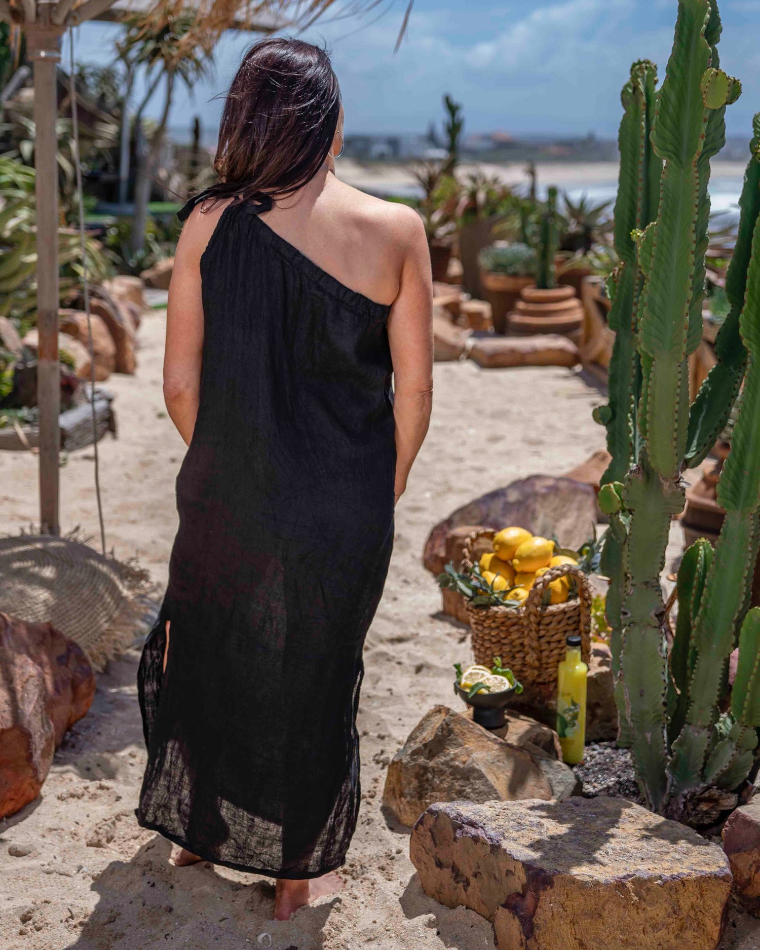 Experience effortless elegance with this 100% linen dress, designed for ultimate comfort and breathability. Featuring side slits from the knee down and an adjustable one-shoulder drawstring, it allows you to style it your way. Perfect for warm days, this dress feels light as air. Please note: the fabric has no stretch—be sure to check the measurements for your ideal fit