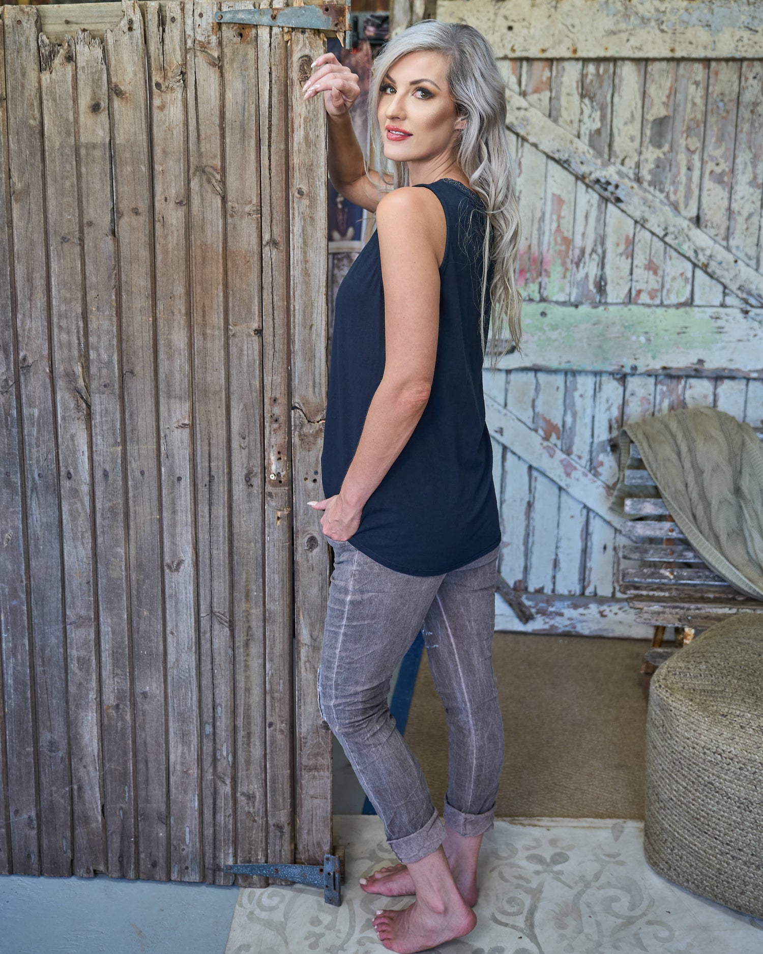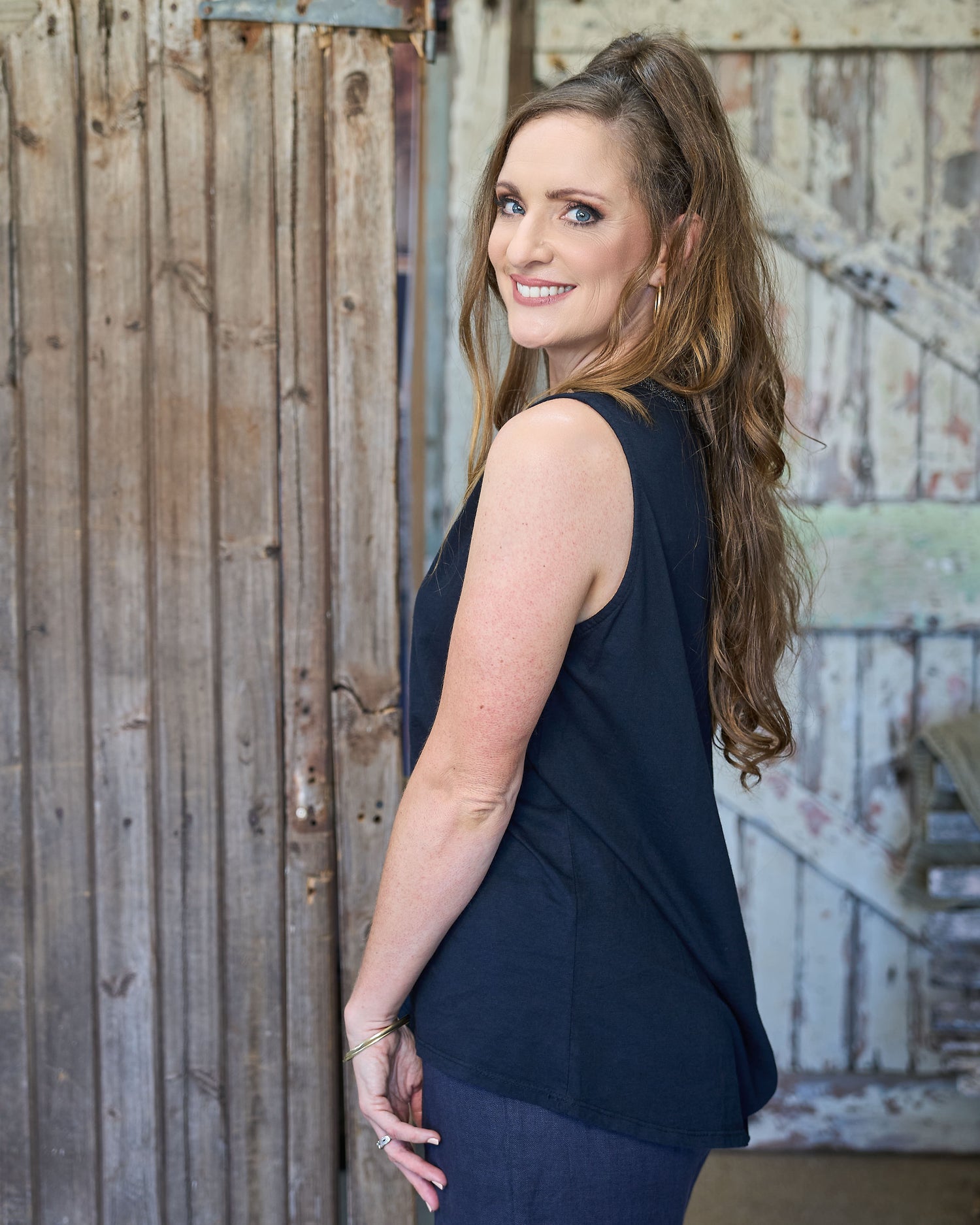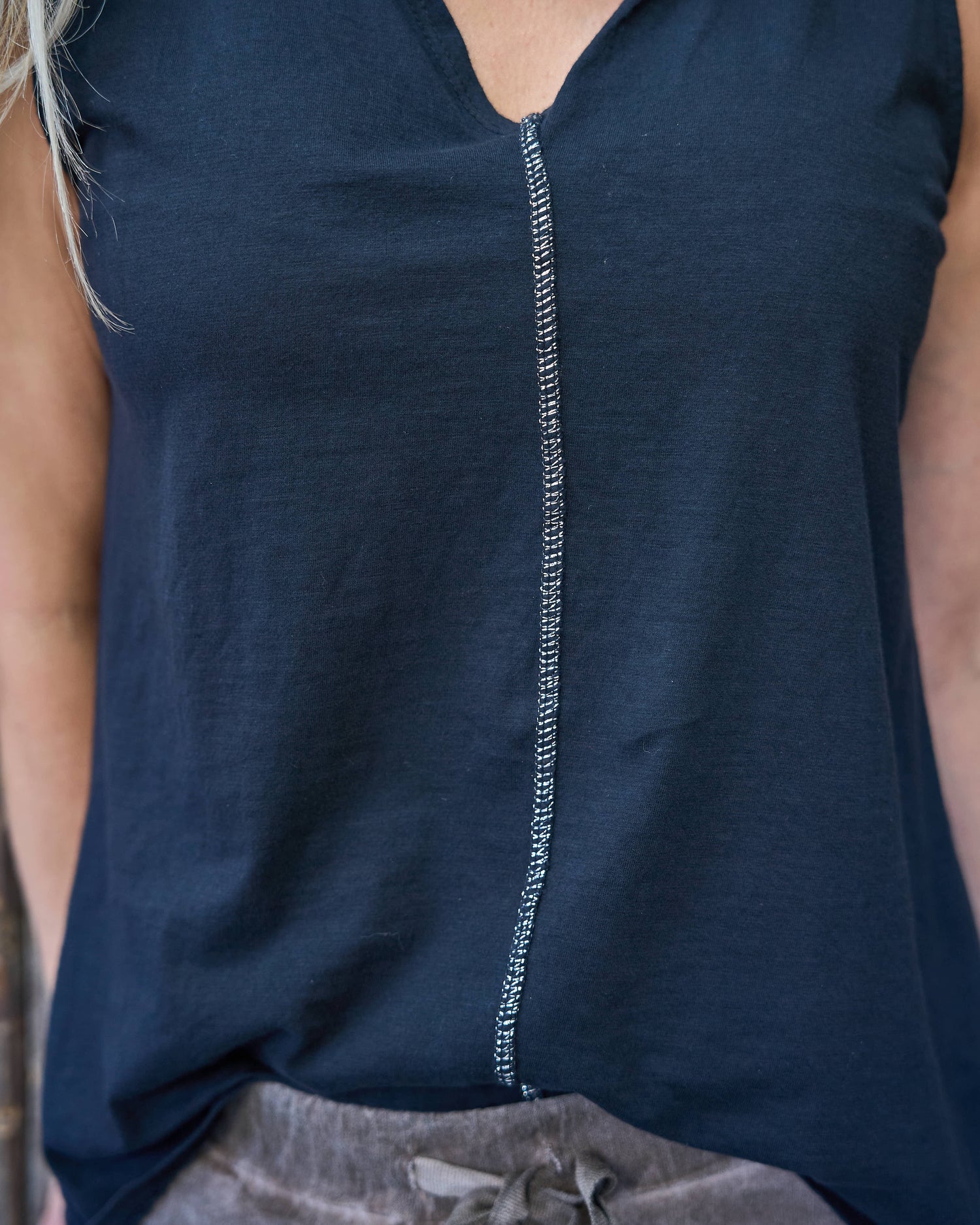 We’re obsessed with these elevated basics - the kind of pieces that prove simple can still be striking. Designed with a clean, flattering silhouette, this sleeveless top is all about the details. The neckline is finished with a beautiful subtle shimmer trim that adds a refined touch, while the metallic-threaded centre seam draws the eye and elongates the shape. Soft, comfortable and easy to style, it’s perfect on its own or layered under jackets and knits