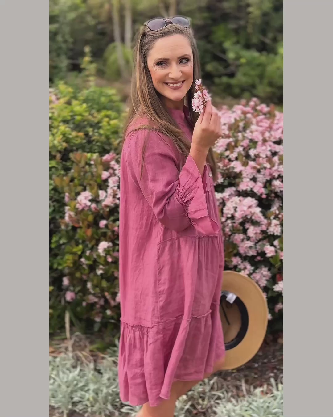 Made for sunny days, this linen dress is the ultimate throw-on-and-go piece. The babydoll-inspired A-line fit keeps it playful, while the frilled sleeves and tiered body give it just the right amount of movement. With a button-down bust panel and elongated neckline, it balances casual charm with a touch of elegance. Fun, airy, and oh-so-easy, it’s the dress you’ll be reaching for all season long. Please note: this style is unlined for a naturally airy feel