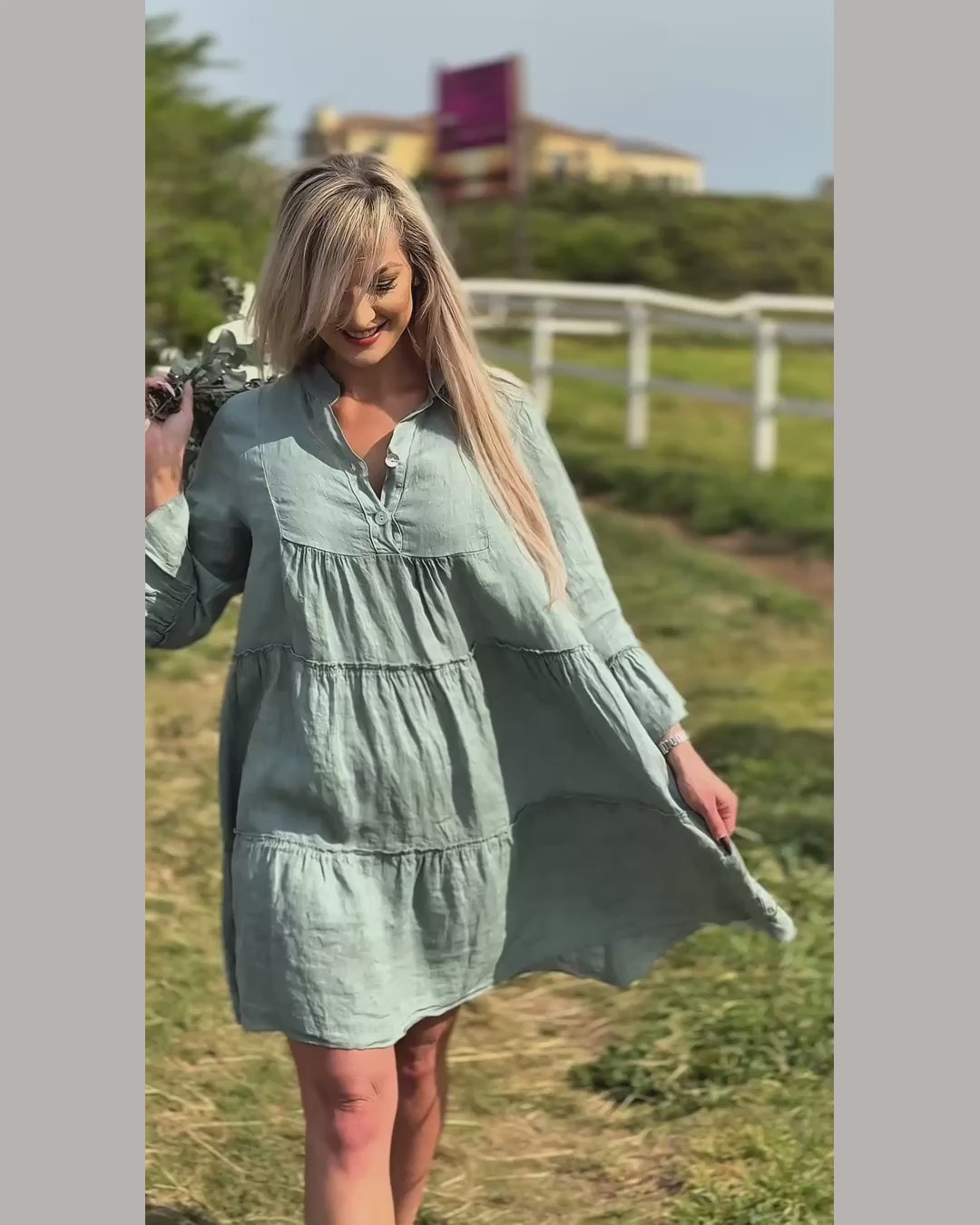 Made for sunny days, this linen dress is the ultimate throw-on-and-go piece. The babydoll-inspired A-line fit keeps it playful, while the frilled sleeves and tiered body give it just the right amount of movement. With a button-down bust panel and elongated neckline, it balances casual charm with a touch of elegance. Fun, airy, and oh-so-easy, it’s the dress you’ll be reaching for all season long. Please note: this style is unlined for a naturally airy feel