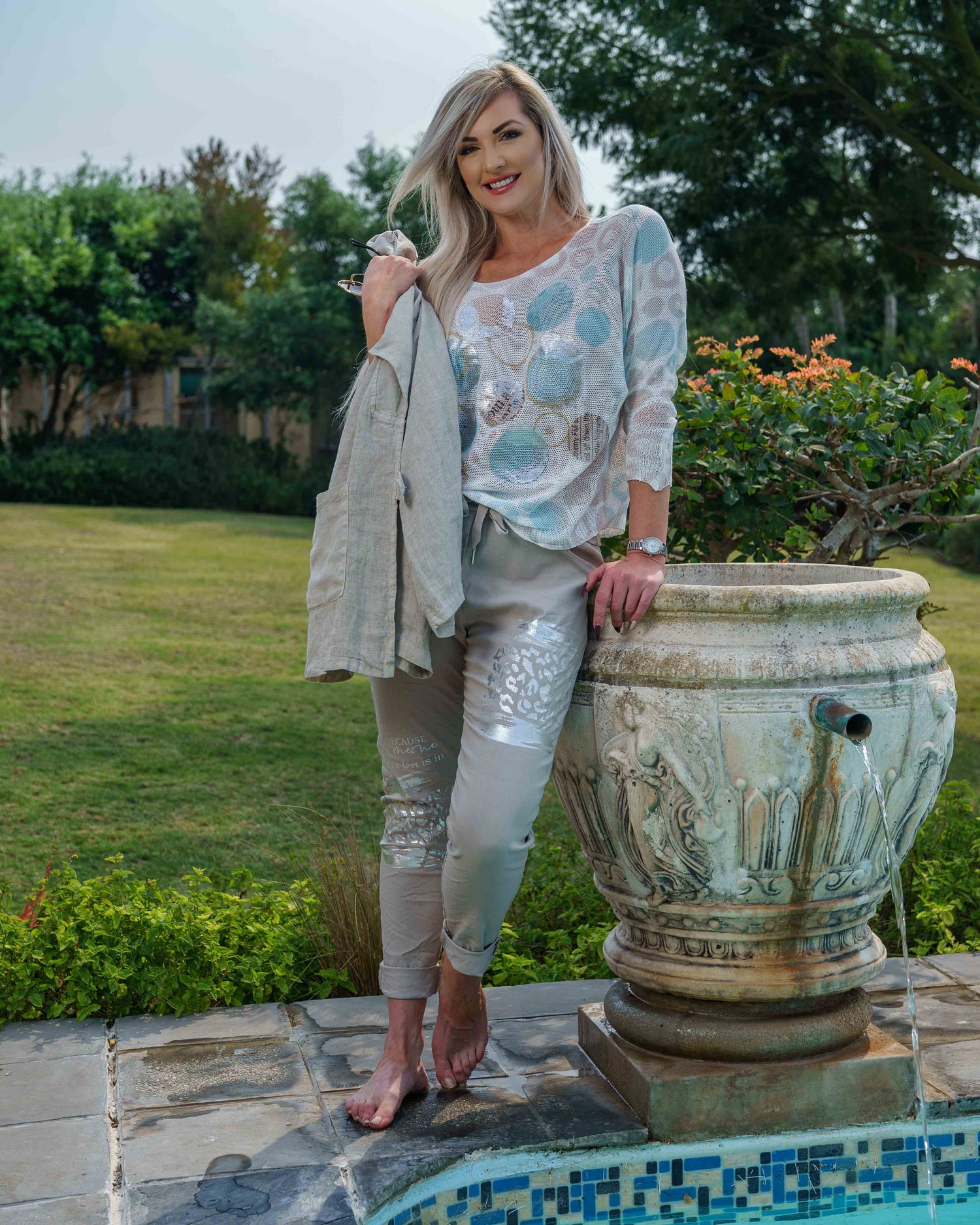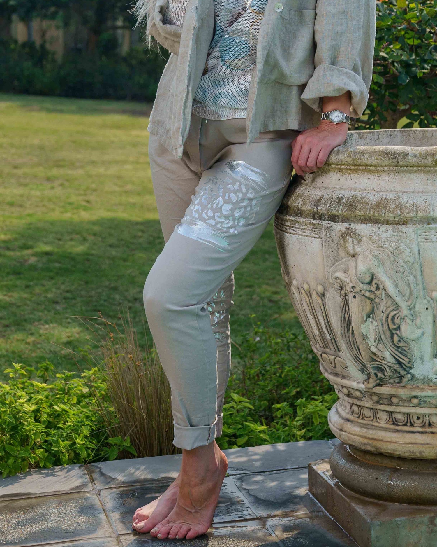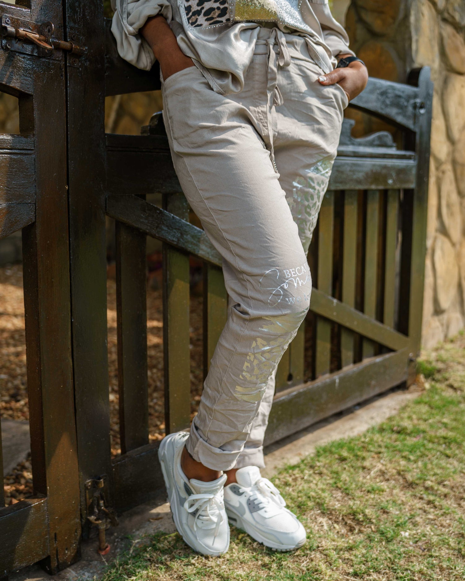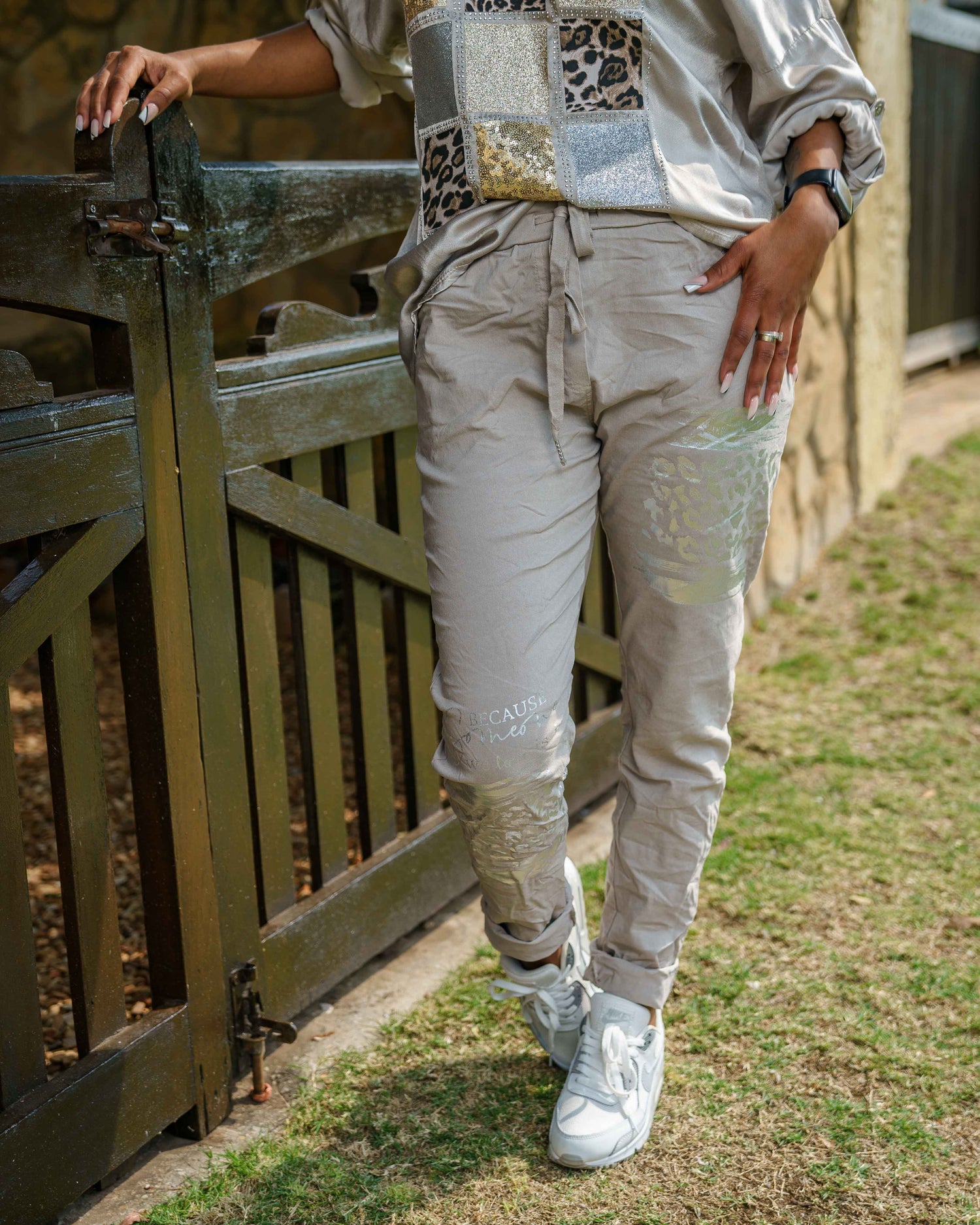 Effortlessly comfortable and endlessly versatile, these drawstring pants are a wardrobe staple you'll reach for again and again. Designed with an elasticated waistband for a flexible fit, they feature soft, stretchy fabric that moves with you. A subtle silver foil decal adds a touch of shine, making them perfect for both casual days and dressed-up moments