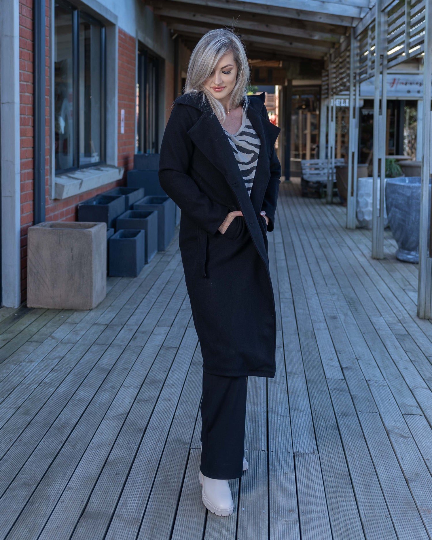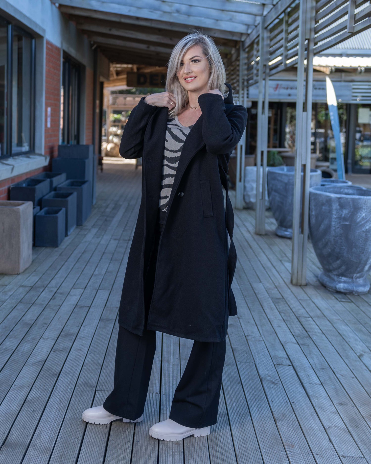 Step into winter with timeless elegance in this beautifully tailored coat. Fully lined on the inside, it offers an unmatched feel against the skin - warm, smooth, and luxurious. The wide open collar adds a dramatic touch, while the double-panel button closure and waistband create a flattering, cinched silhouette. Deep side pockets make it as practical as it is polished - a true cold-weather essential