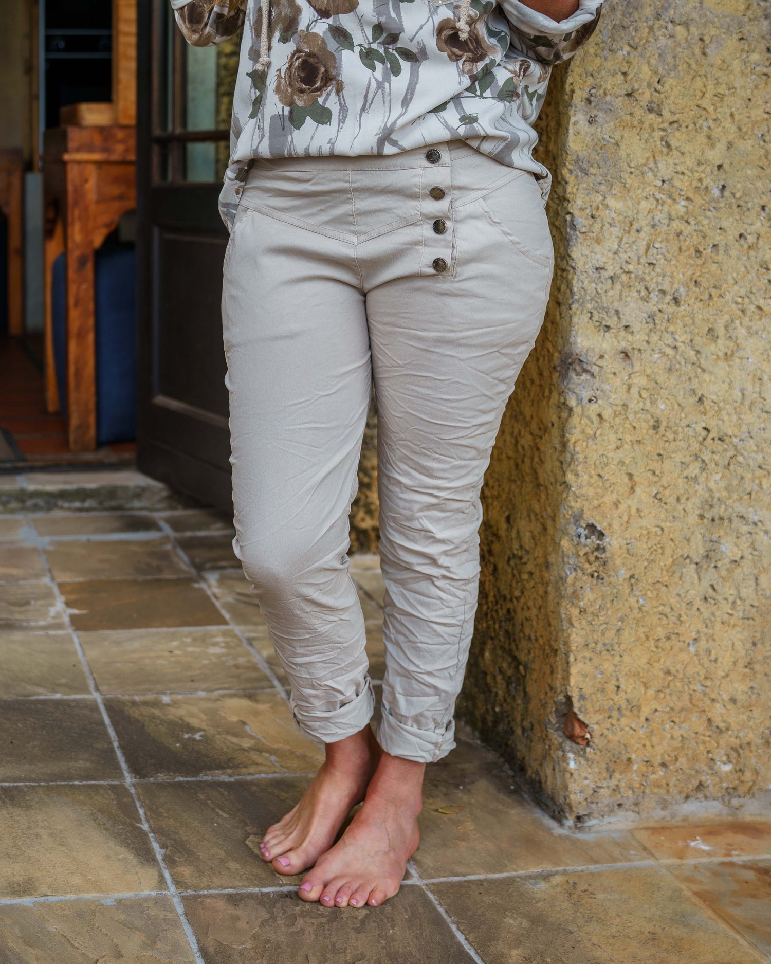 Pull-up pants designed to flatter and move with you. The five-button closure along the side not only adds a chic touch but also gives the pants a unique character. With a mid to high waistline, they naturally accentuate your curves while offering a comfortable, secure fit. The clever double seam detailing across the tummy creates a structured effect that keeps you feeling tucked in and confident. Made from a soft, high-stretch fabric, these pants are designed to be your go-to for everyday wear