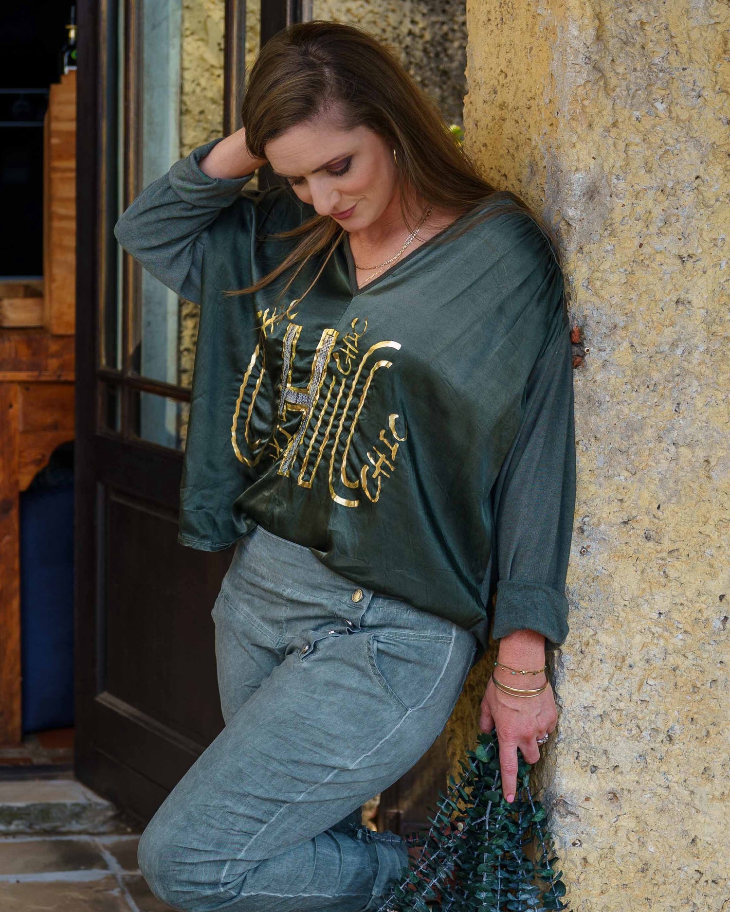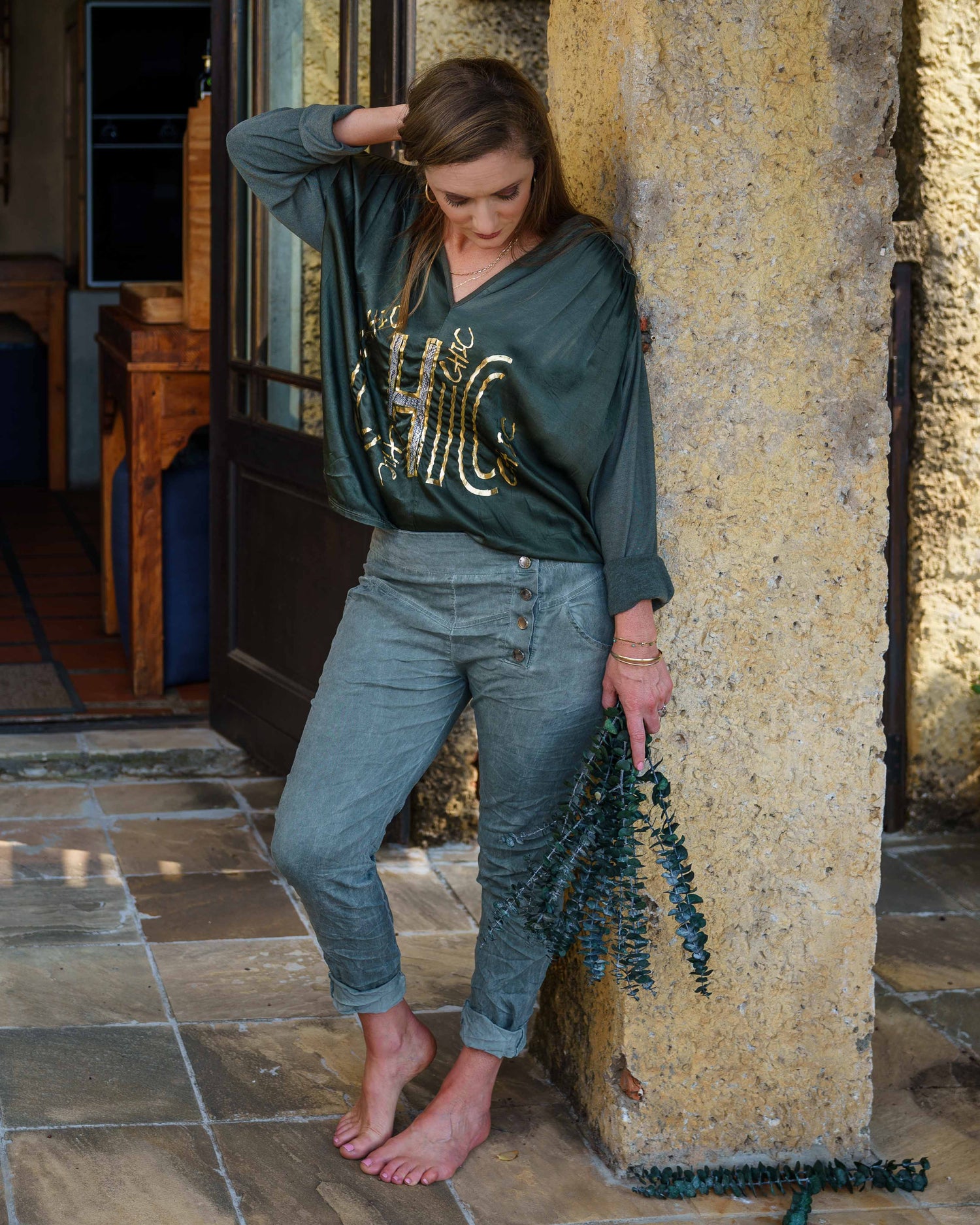 Slip into effortless style with this slinky silky-feel top, designed to catch the light and turn heads. The front panel and half sleeve shimmer with a silky sheen, while the soft viscose back drapes beautifully for all-day comfort. Ruched shoulder seams add an elegant touch, creating a flattering silhouette that feels as good as it looks. Finished with a foil decal and subtle sequins spelling out "Chic," it’s a statement piece that shines on its own