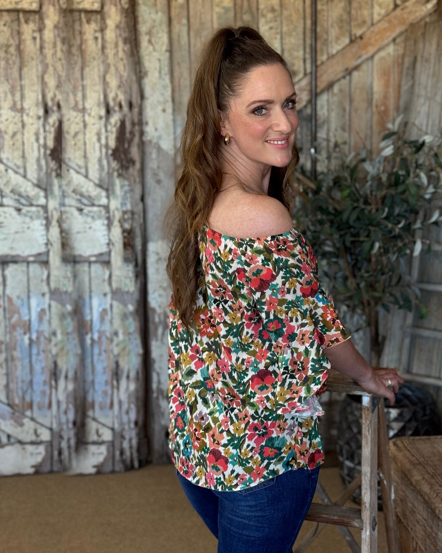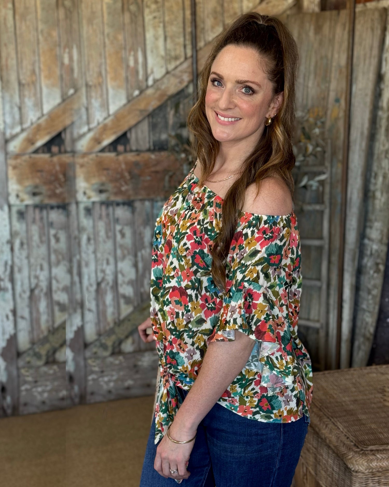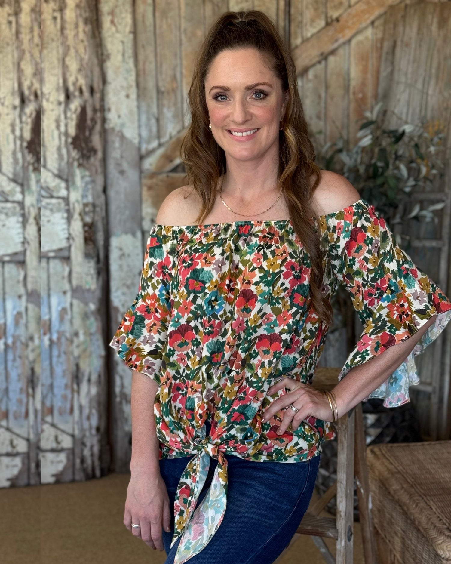 Light, cool, and beautifully flowy, this viscose top brings effortless summer charm with its soft off-the-shoulder design that highlights the collarbones. The elbow-length sleeves end in a dramatic flared hem, adding movement and a touch of flair to every step. Its colourful pattern feels fresh and eye-catching, while the front tie twist allows you to style it your way relaxed or refined. Airy, playful, and perfect for warm days out