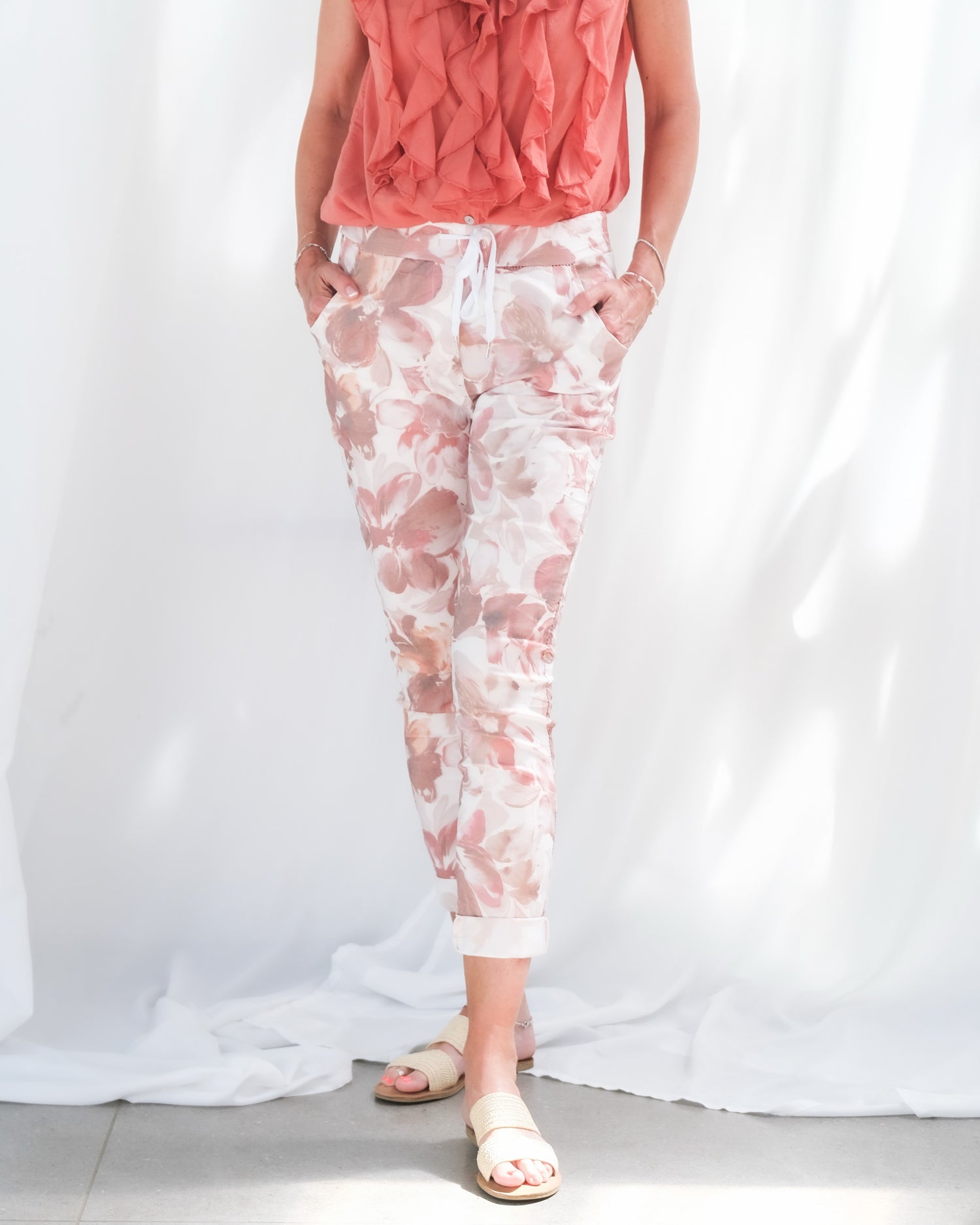 These drawstring pants are the kind you’ll want to live in all summer long. With a comfy elasticated waist and an adjustable drawstring, they give you the perfect personalized fit every time. The fabric has just the right amount of stretch to keep things easy and breezy, while still looking effortlessly stylish. Two side pockets and two back pockets add both function and flair. The best part? The floral decals in browns, mauves and pink – a dreamy color mix that makes pairing and matching a total breeze