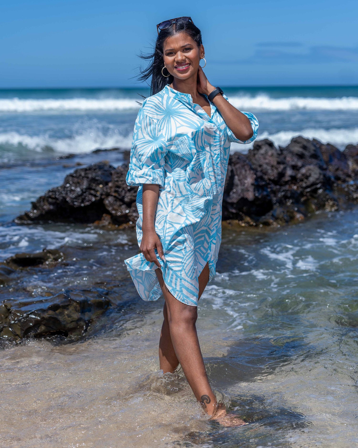 With the same airy slip-like feel and easy summer silhouette, this dress shines in its boldest colour option yet. The full button-down front and decorative breast pockets keep the look relaxed and playful, while the soft flat collar and V-neckline create a flattering shape. Sleeve tabs offer styling freedom, and the slightly longer back hem adds flow for effortless warm-weather wear. This print pops with bright lumo colours that come alive in the sun - the perfect match for a glowing summer tan.