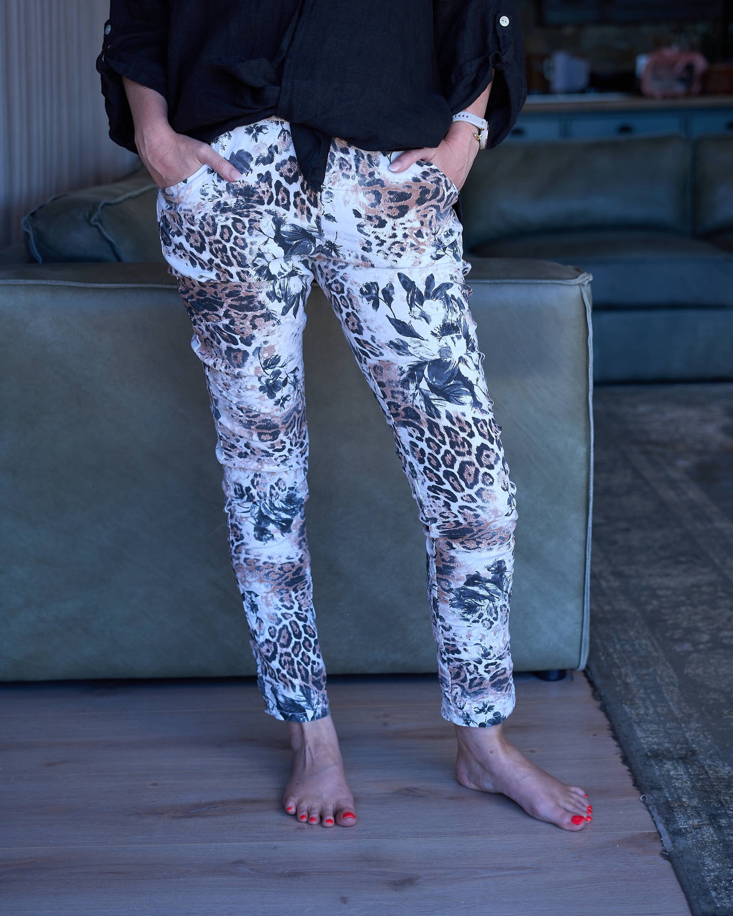 These drawstring pants are all about comfort with a little extra flair. The elasticated waist with drawstring gives you the perfect adjustable fit, while the fabric has a soft stretch and stays cool on warm days. Two side pockets and two back pockets bring a casual, easygoing feel. The neutral base is covered in bold leopard prints in caramel browns, dark greys, and charcoal, with a subtle floral touch peeking through. Finished off with a two-tone woven belt and silver buckle, this pair is effortlessly stylish and ready to stand out