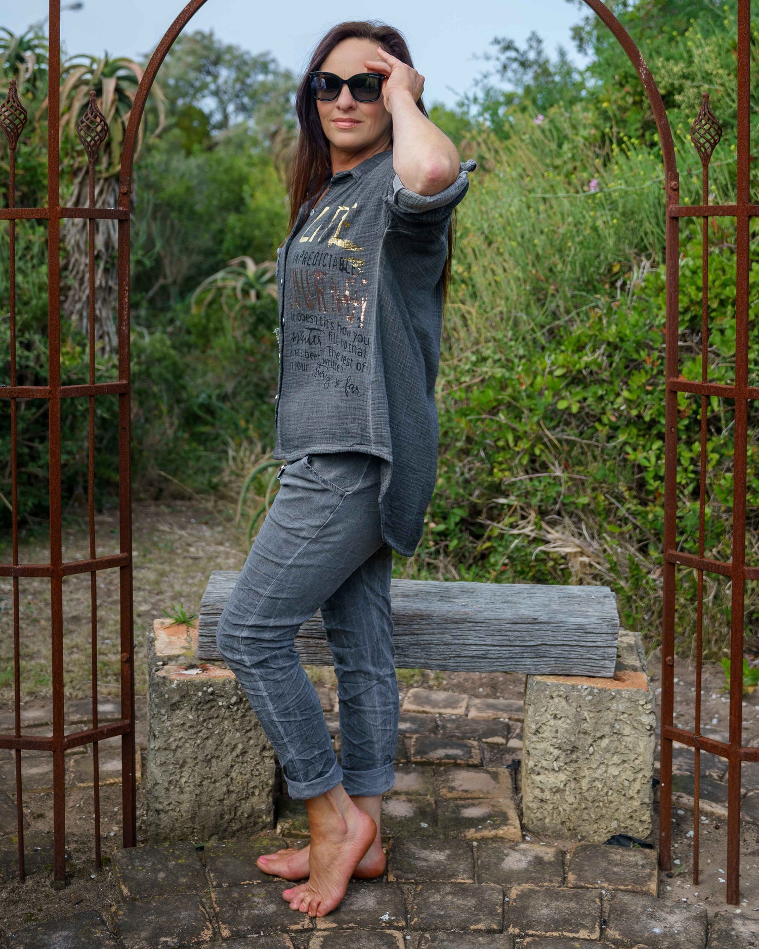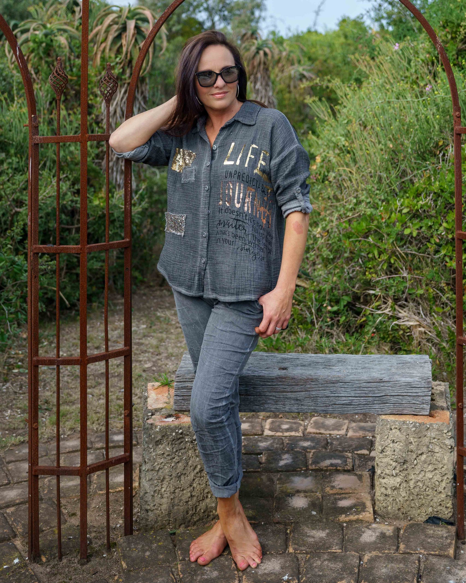 This show stopping top brings together comfort and flair in a way that feels effortless. Made from 100% cotton with a muslin-inspired texture, it’s airy and breathable – perfect for warm days and balmy evenings. The soft collar and button-down front panel give it a polished touch, while the long sleeves with pull tab option let you switch up your look with ease. Finished with gold and rose gold foil accents, black script detailing, and golden sequin patchwork, it’s a true statement piece with playful summer sparkle. Finished with a cold-wash dye, each pair has subtle uneven colouring that adds depth and individuality, making them truly one-of-a-kind