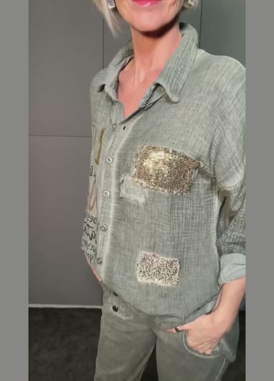 This show stopping top brings together comfort and flair in a way that feels effortless. Made from 100% cotton with a muslin-inspired texture, it’s airy and breathable – perfect for warm days and balmy evenings. The soft collar and button-down front panel give it a polished touch, while the long sleeves with pull tab option let you switch up your look with ease. Finished with gold and rose gold foil accents, black script detailing, and golden sequin patchwork, it’s a true statement piece with playful summer sparkle. Finished with a cold-wash dye, each pair has subtle uneven colouring that adds depth and individuality, making them truly one-of-a-kind