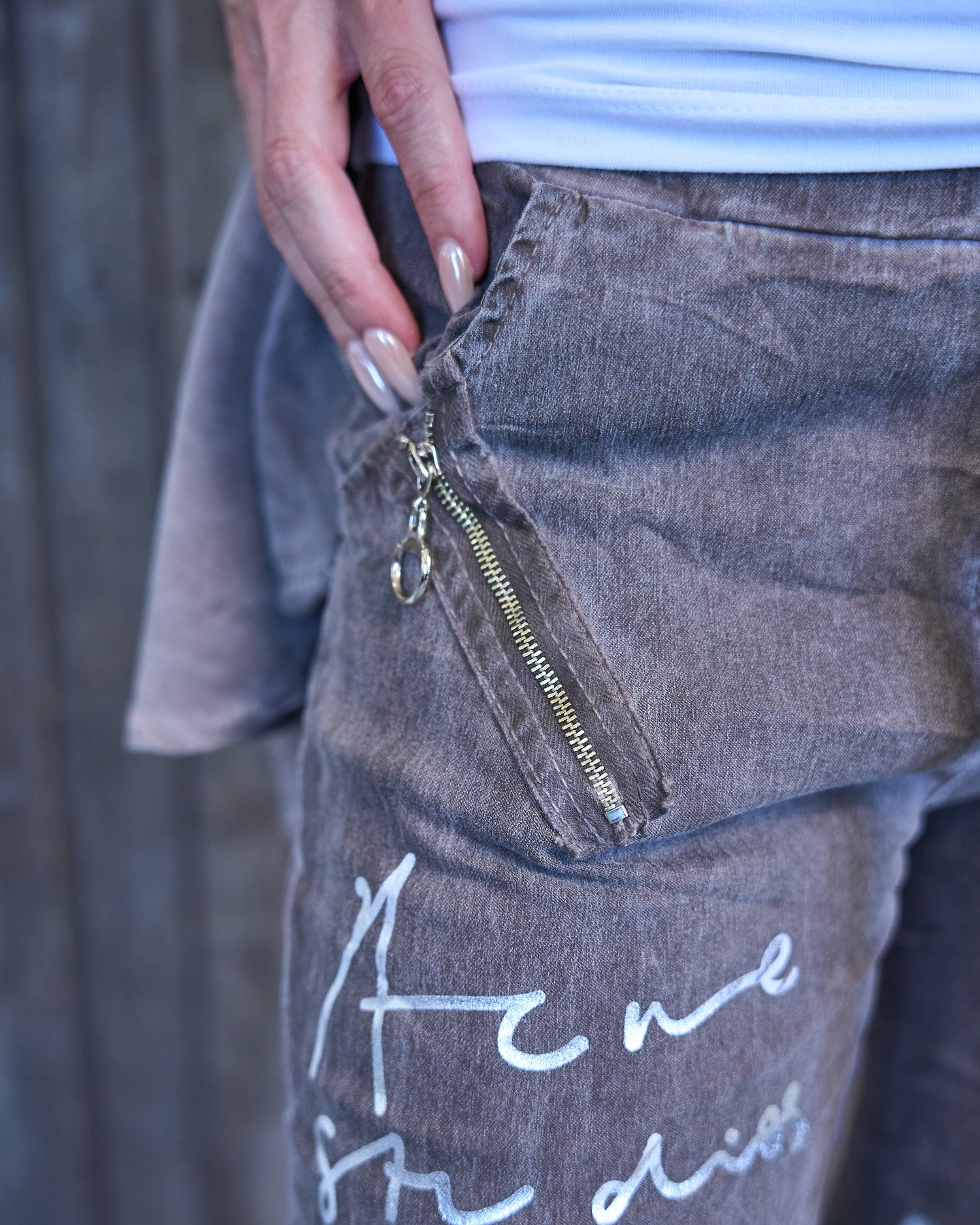 - Decorative zip and silver script