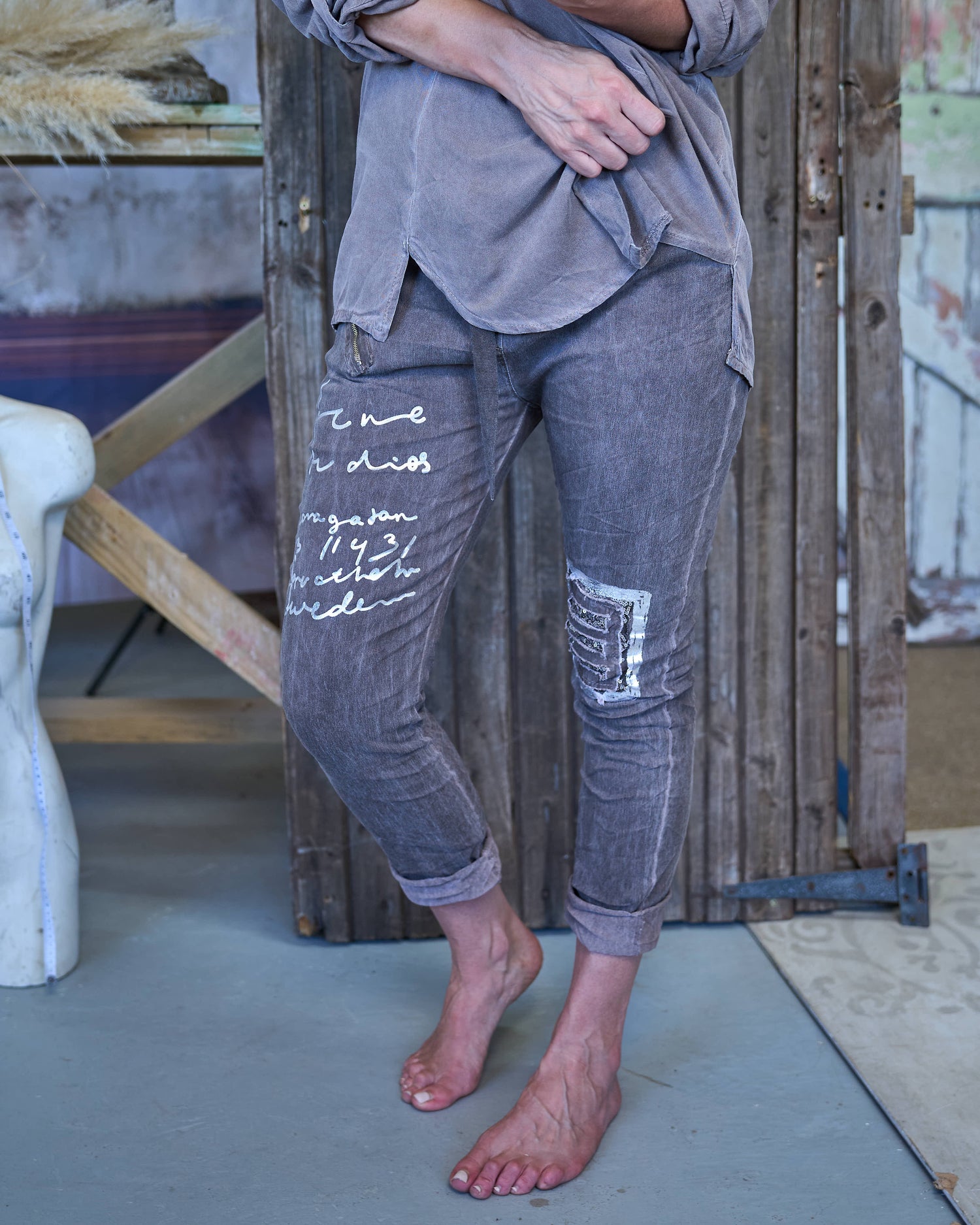 These drawstring pants bring together comfort and standout detail in the most effortless way. Designed with a soft stretch fabric and an easy elasticated waistband, they offer a relaxed yet flattering fit you’ll love wearing all day. The adjustable drawstring lets you personalise the fit, while the decorative zip detail, silver script print and sequin patch accents add a touch of edgy sparkle. Comfortable, stylish and full of personality, these pants are perfect for elevating your everyday look